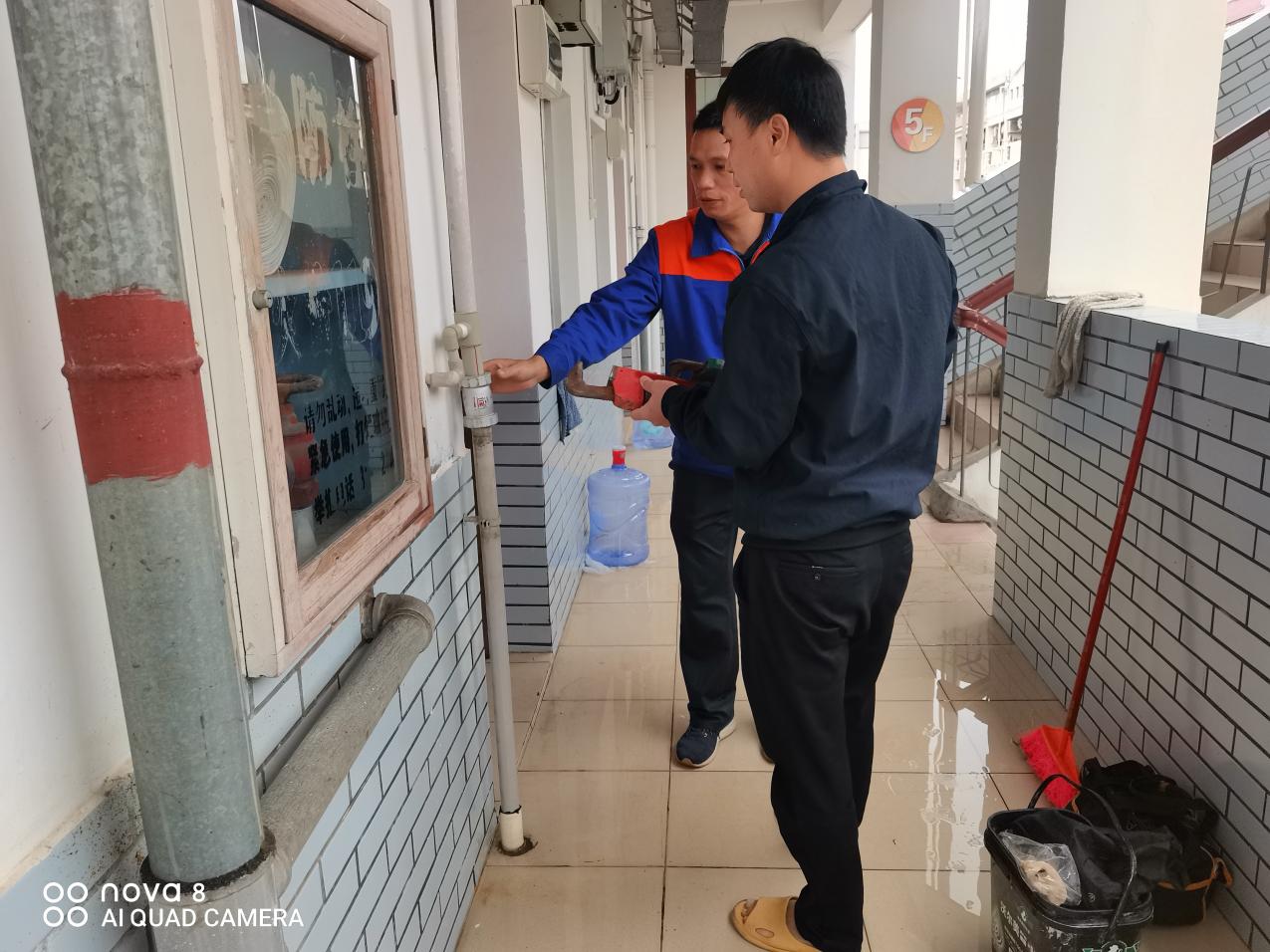 工作人员和施工方到东27栋b226宿舍处理宿舍门口天花板漏水问题