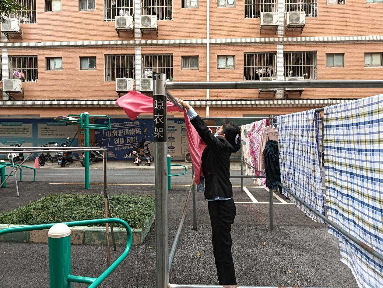 工作人员拾起同学们掉落衣物晾晒至公共晾衣架