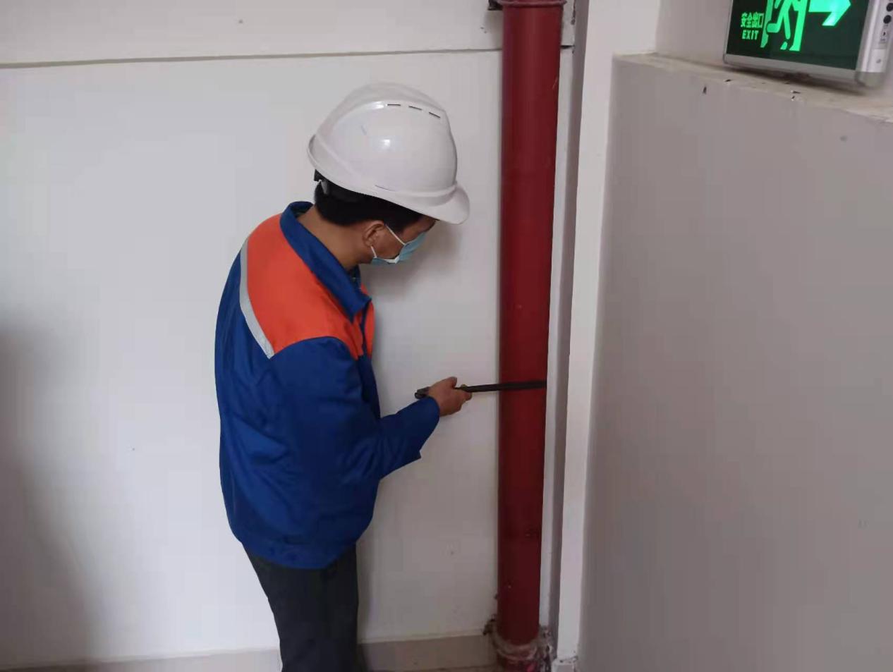 工作人员检查公共区域消防水管情况