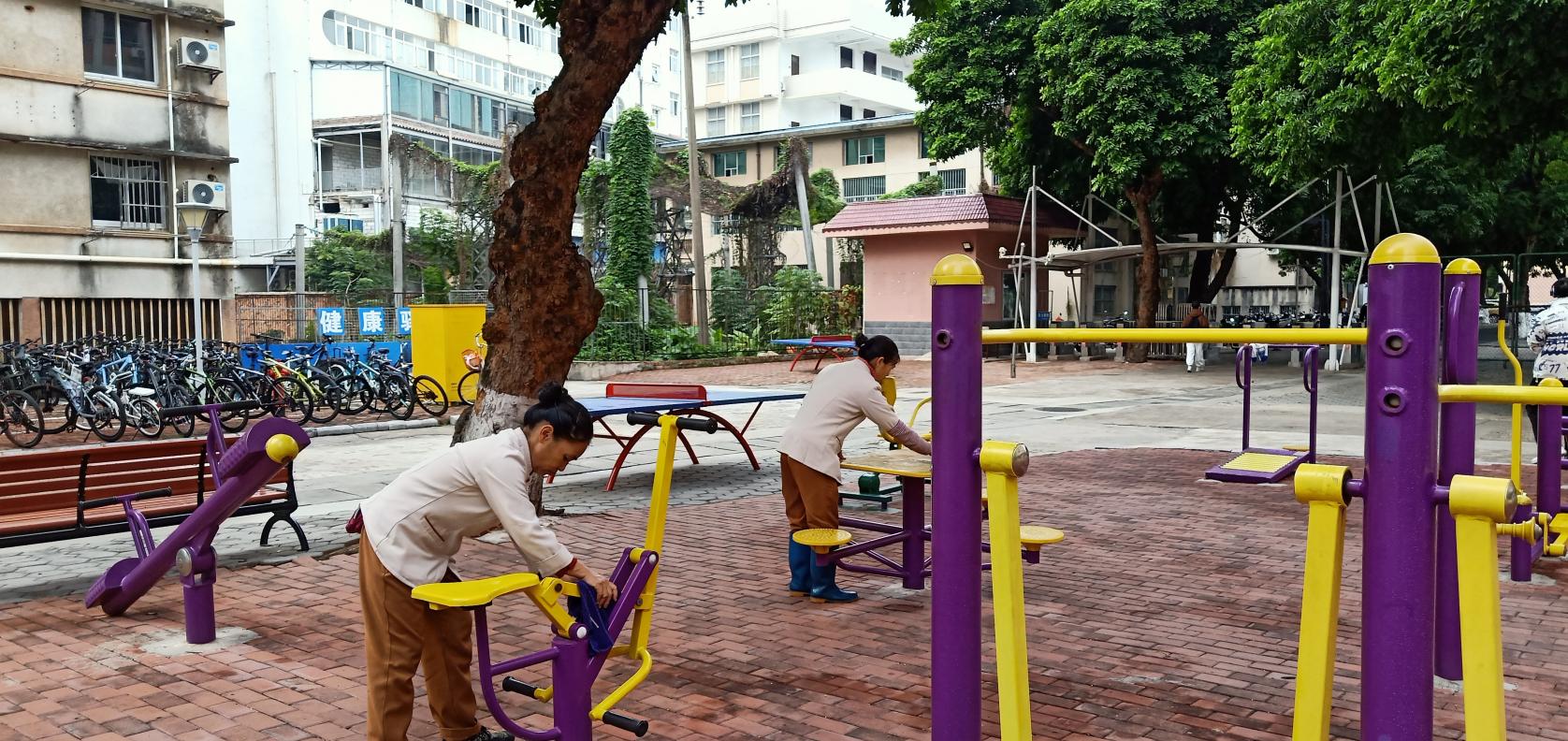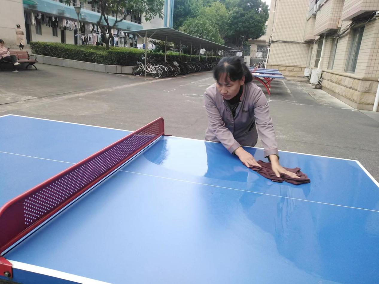 保洁人员擦拭园区乒乓球桌