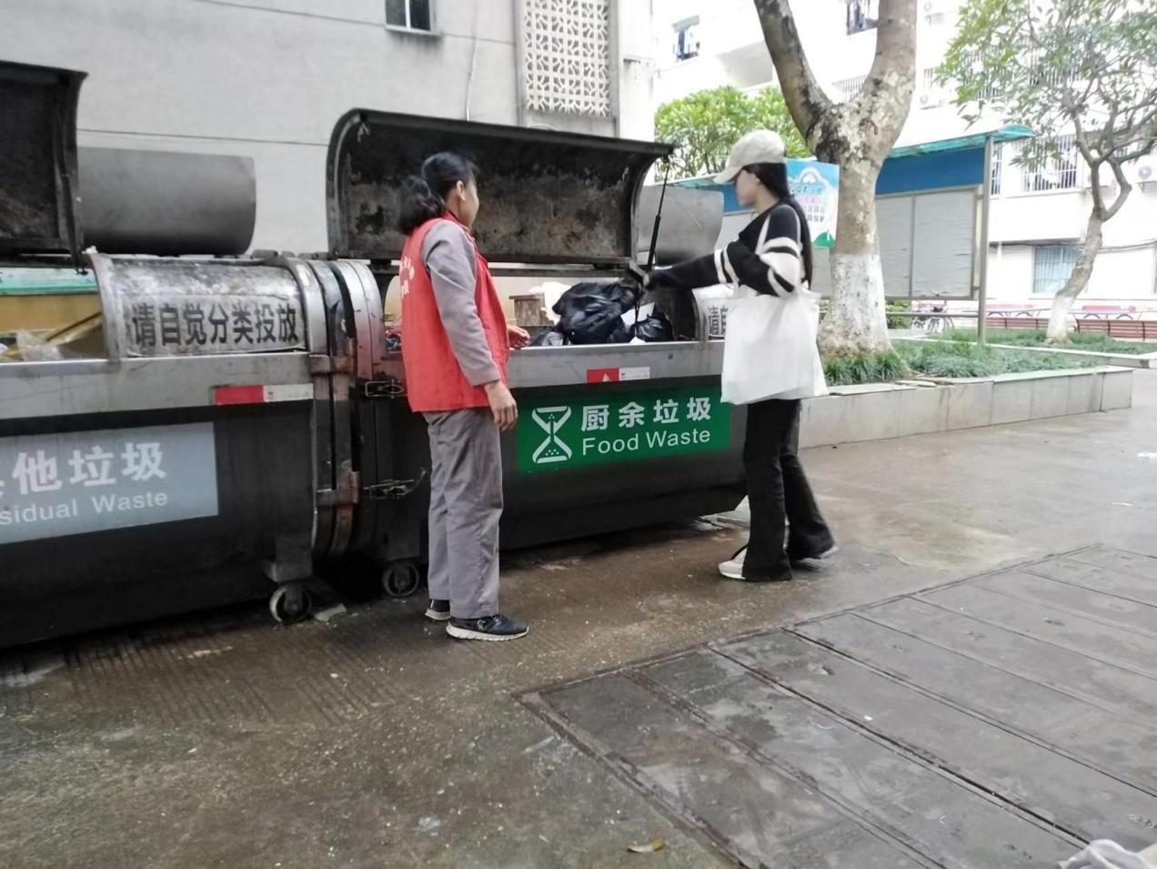 垃圾分类督导员引导同学分类垃圾