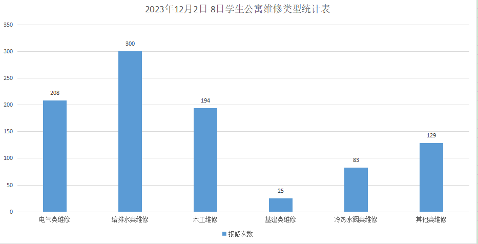 2023年12月2日-2023年12月8日后勤服务24小时报修中心接电话报修、网上报修、现场报修1193单,其中学生公寓报修939单(已完工932单,完工率99.2%,余7单在维修中),其中电气类208单,木工类194单,给排水类300单,基建类25单,冷热水阀类83单,其他类129单,余下254单由其他岗位负责完成维修;在做好每天日常维修的同时,坚持对学生公寓183间电表房, 2个水泵房每天巡检。