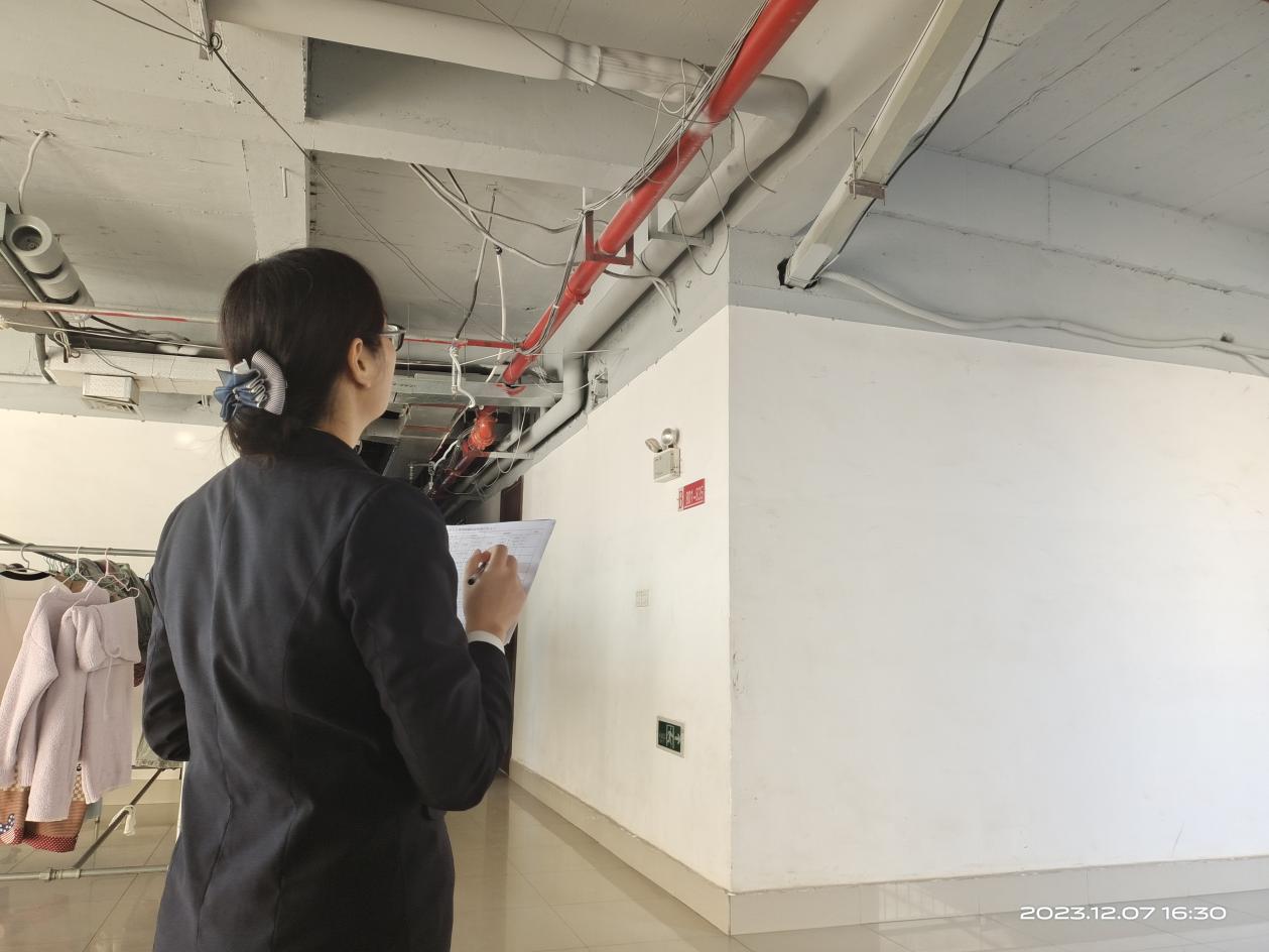 工作人员巡查楼栋消防器材