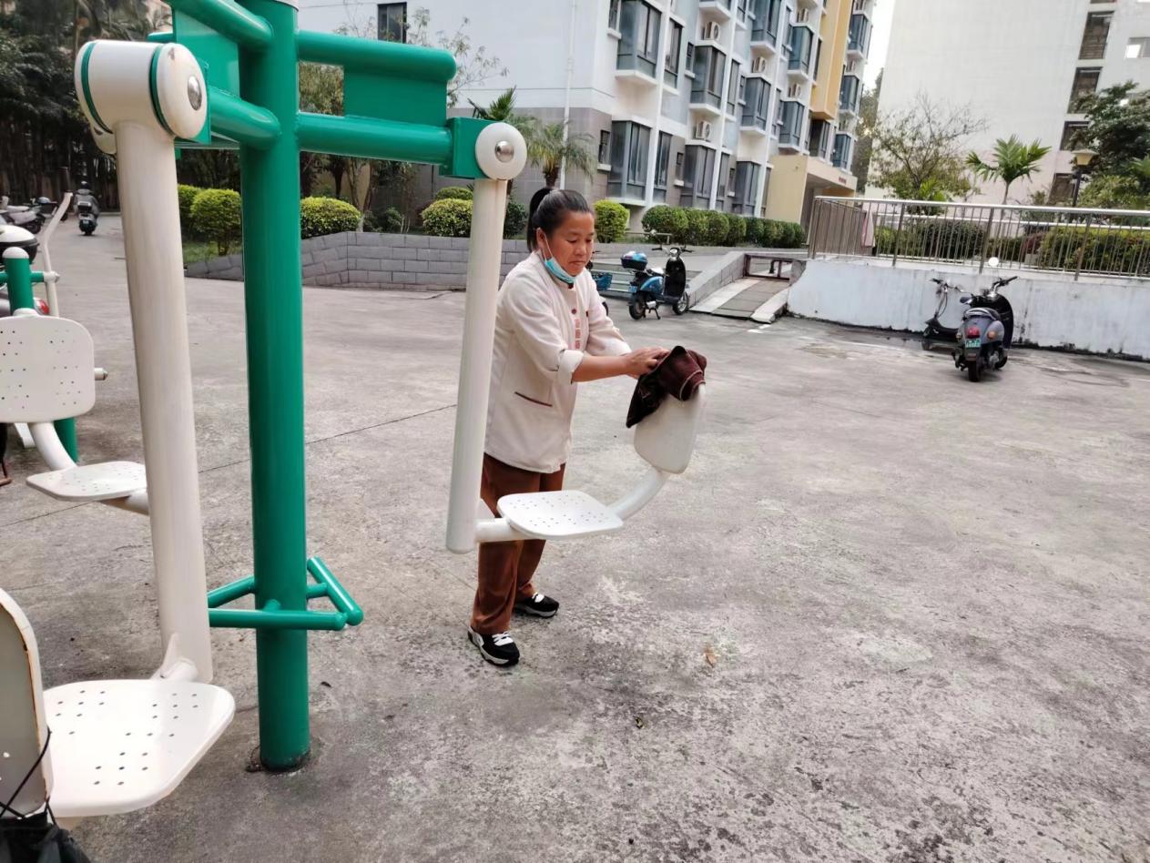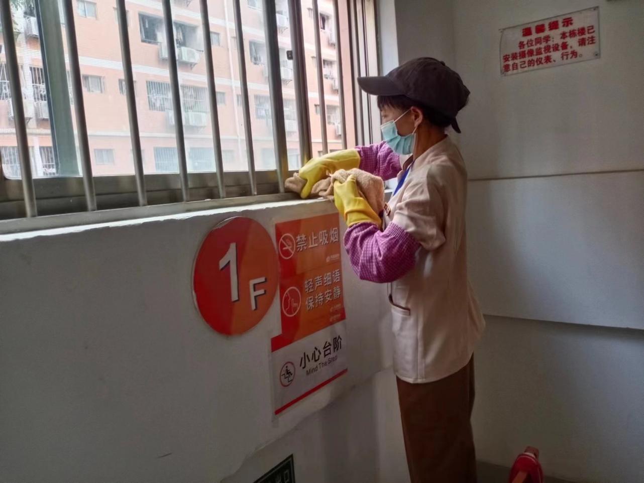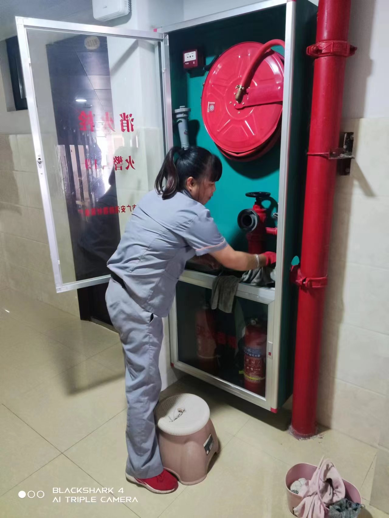 认真做好园区内各种设备设施和33间自习室的保洁维护工作。每日检测园区热水机组温度以及洗衣机的运营情况,定时检查园区消防设备设施情况。擦拭学生公寓园区内472个生活设施(其中公共长椅102张,乒乓球桌152张,晾衣架134个、健身器材84个)。