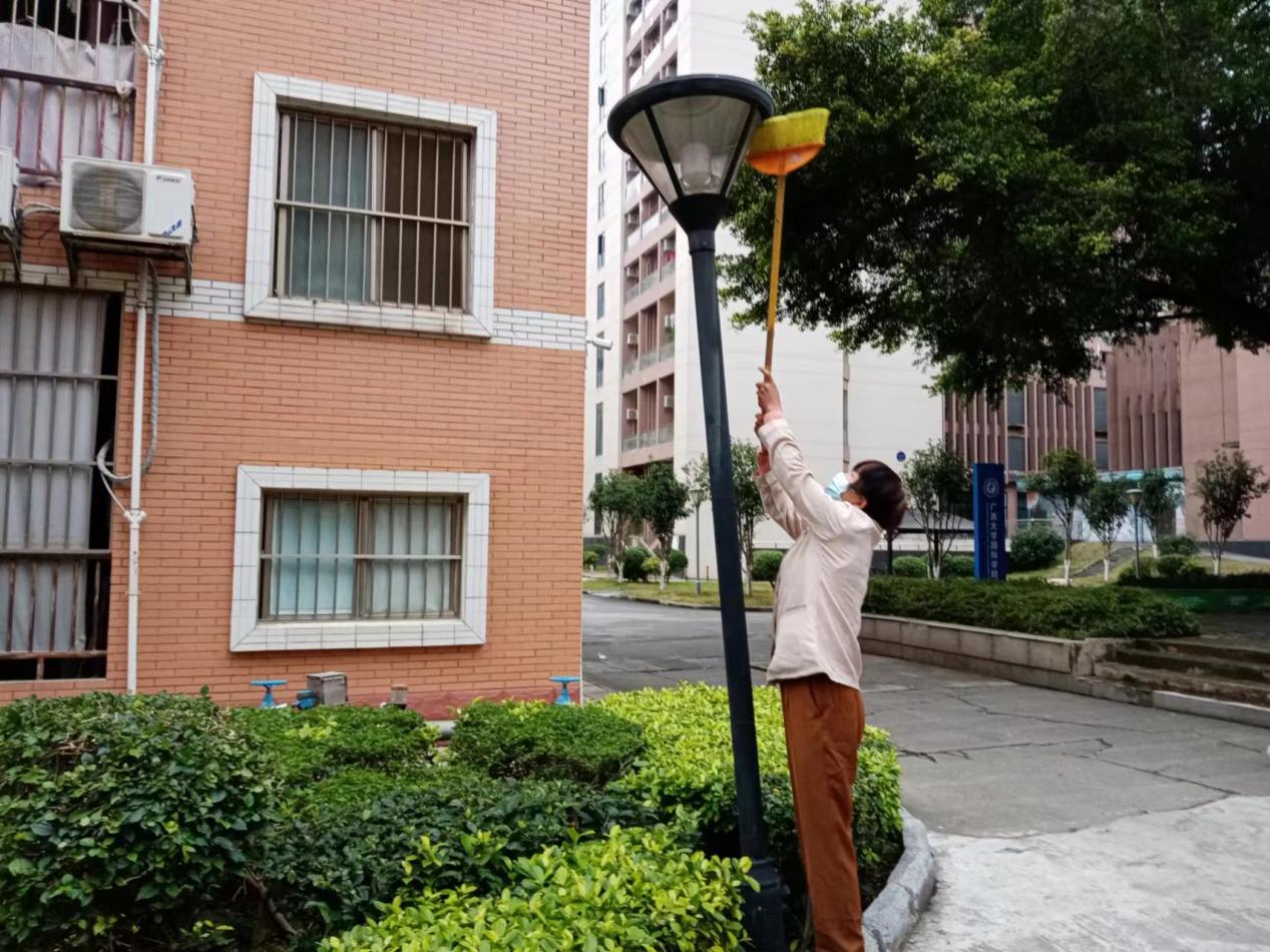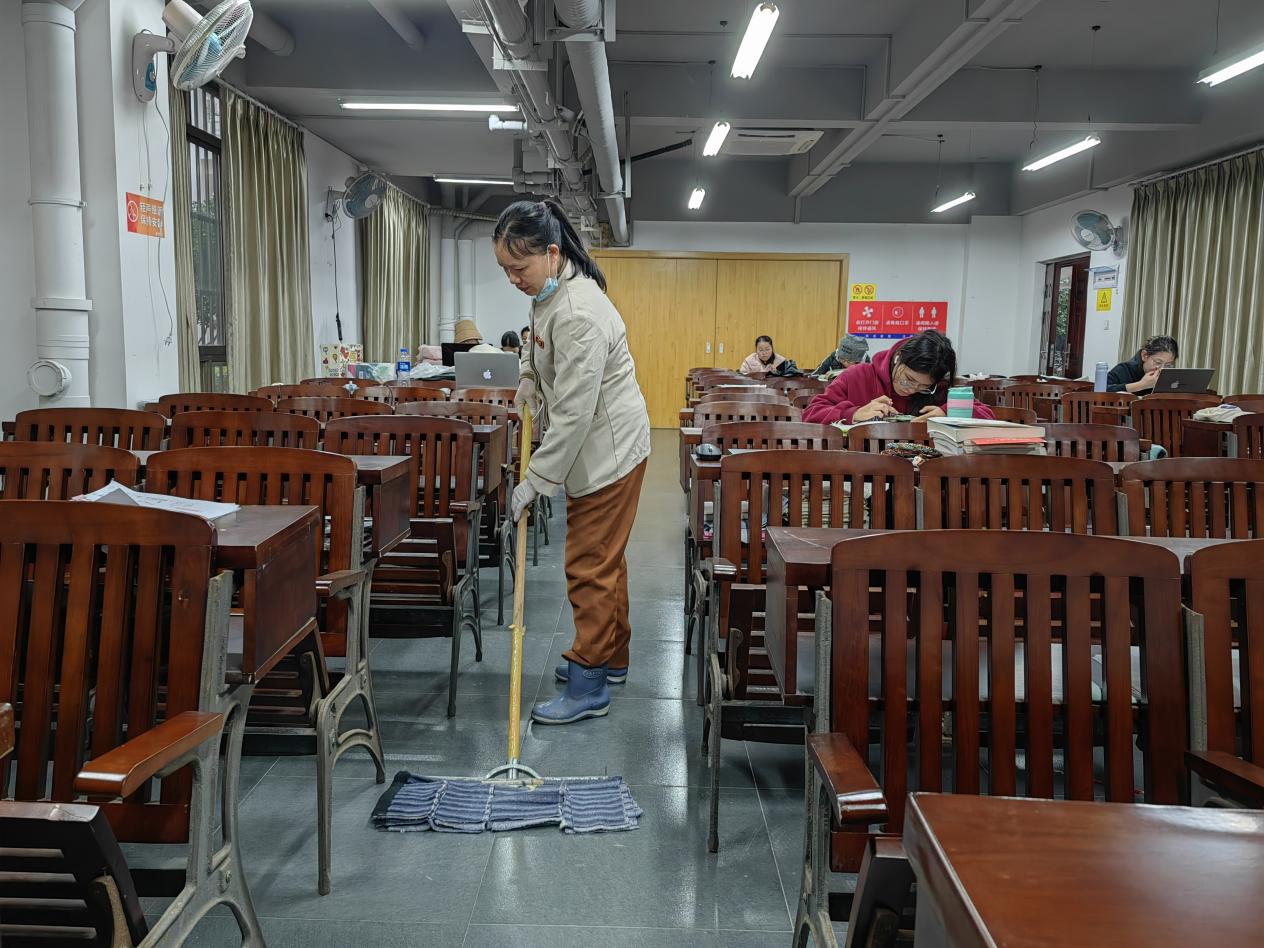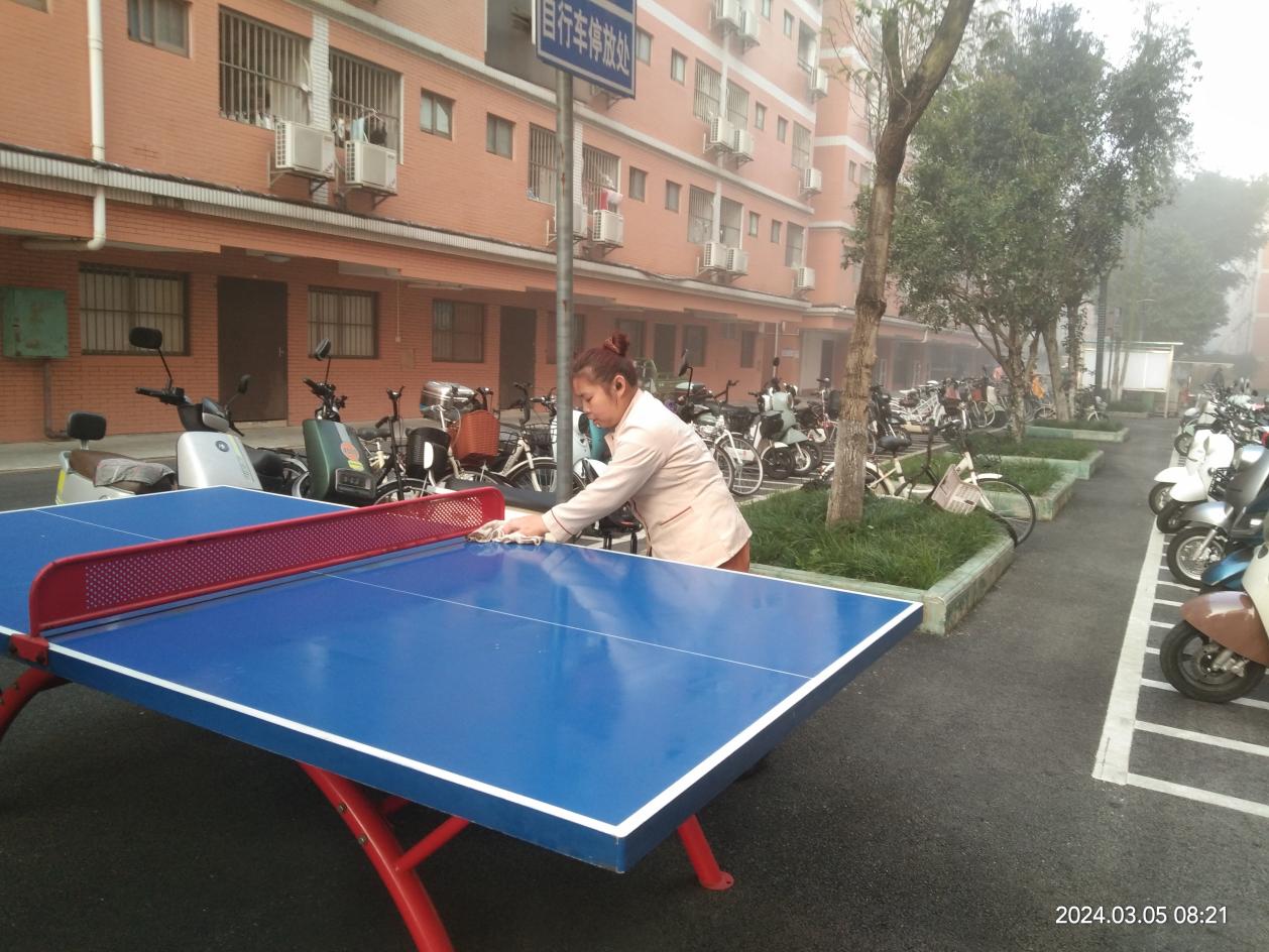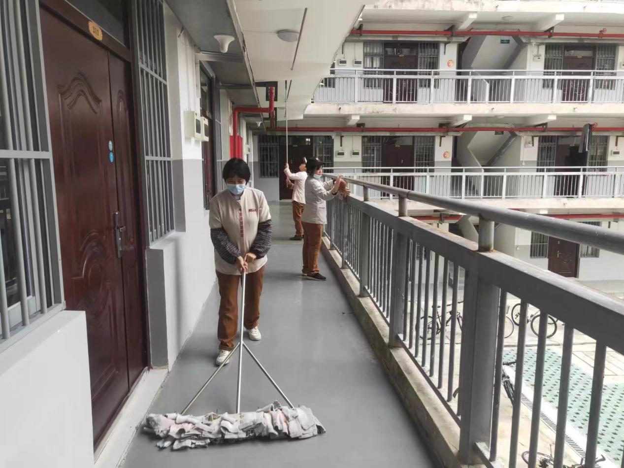 认真做好园区内各种设备设施和33间自习室的保洁维护工作。每日检测园区热水机组温度以及洗衣机的运营情况,定时检查园区消防设备设施情况。擦拭学生公寓园区内472个生活设施(其中公共长椅102张,乒乓球桌152张,晾衣架134个、健身器材84个)。