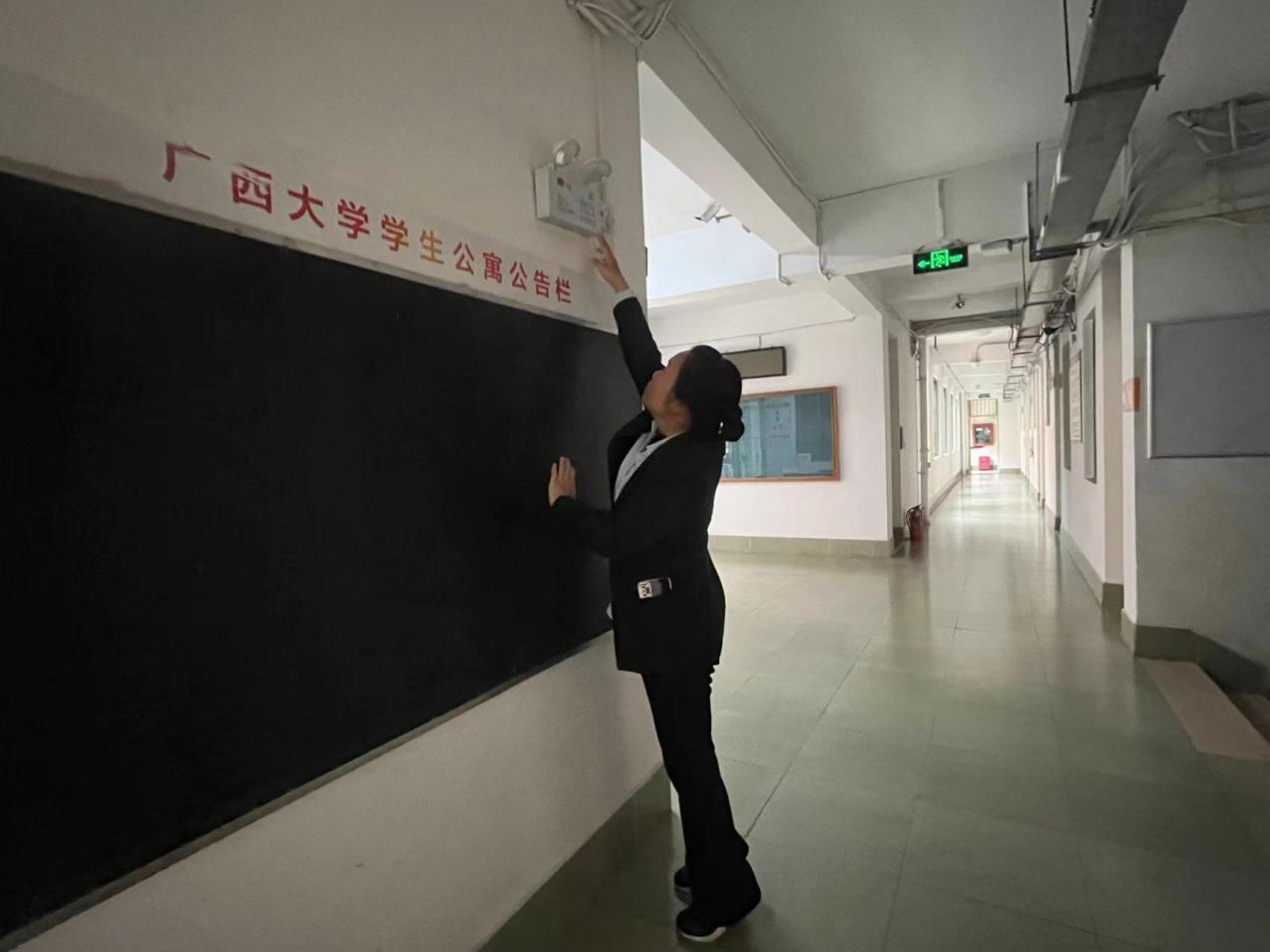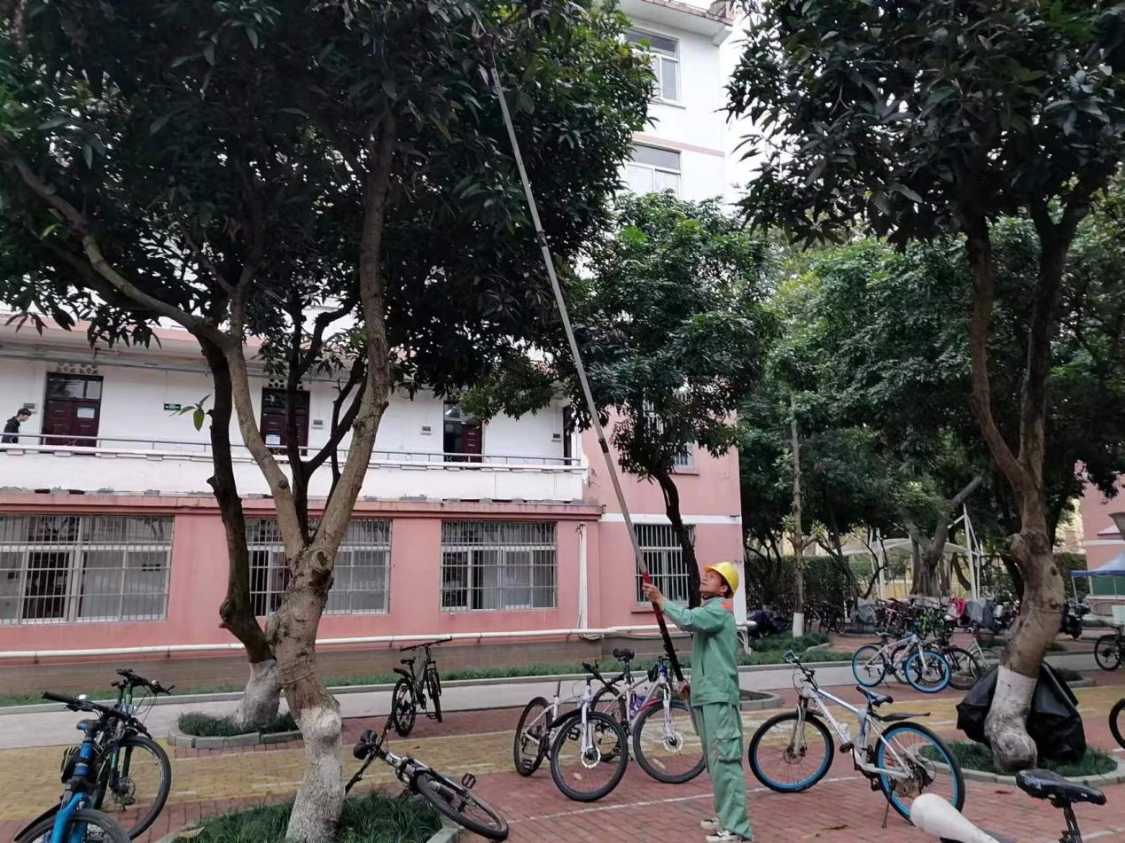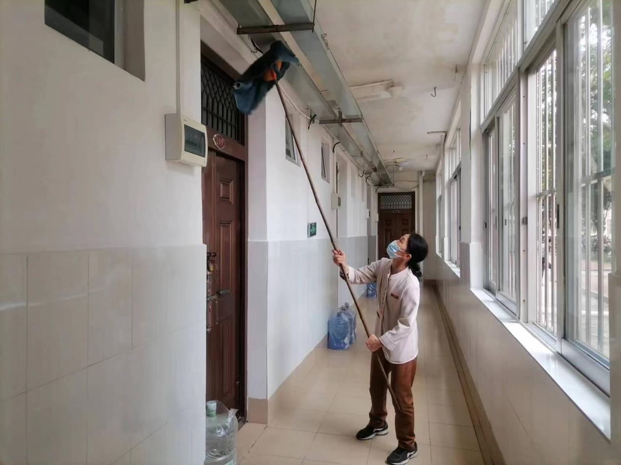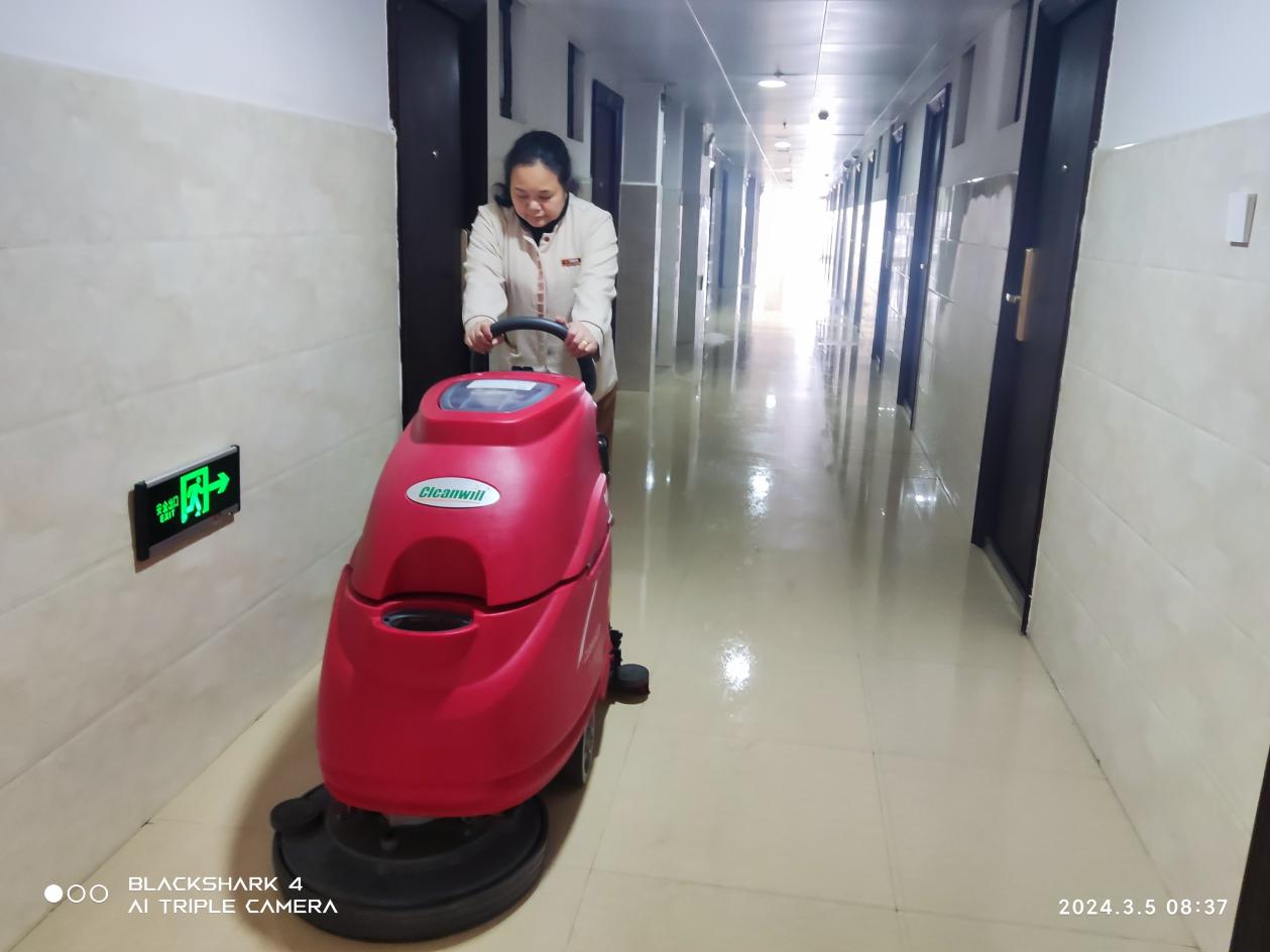 认真做好园区内各种设备设施和33间自习室的保洁维护工作。每日检测园区热水机组温度以及洗衣机的运营情况,定时检查园区消防设备设施情况。擦拭学生公寓园区内472个生活设施(其中公共长椅102张,乒乓球桌152张,晾衣架134个、健身器材84个)。
