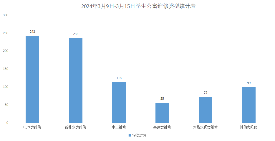 2024年3月9日-15日后勤服务24小时报修中心接电话报修、网上报修、现场报修1035单,其中学生公寓报修816单(已完工795单,完工率97.4%,余21单在维修中),其中电气类242单,木工类113单,给排水类235单,基建类55单,冷热水阀类72单,其他类99单,余下219单由其他岗位负责完成维修;在做好每天日常维修的同时,坚持对学生公寓183间电表房, 2个水泵房每天巡检。