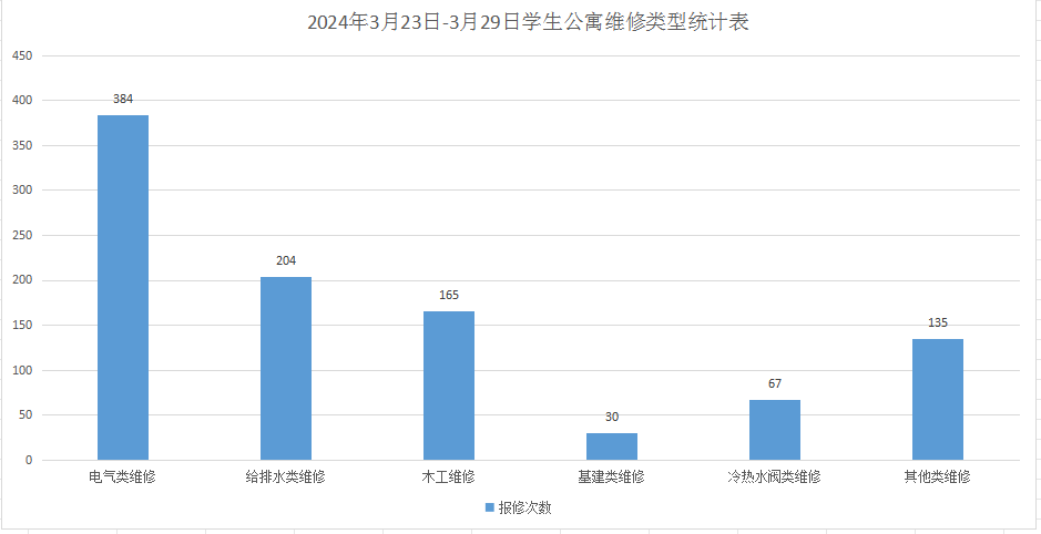 2024年3月23日-29日后勤服务24小时报修中心接电话报修、网上报修、现场报修1525单,其中学生公寓报修985单(已完工962单,完工率97.6%,余23单在维修中),其中电气类384单,木工类165单,给排水类204单,基建类30单,冷热水阀类67单,其他类135单,余下540单由其他岗位负责完成维修;在做好每天日常维修的同时,坚持对学生公寓183间电表房, 2个水泵房每天巡检。
