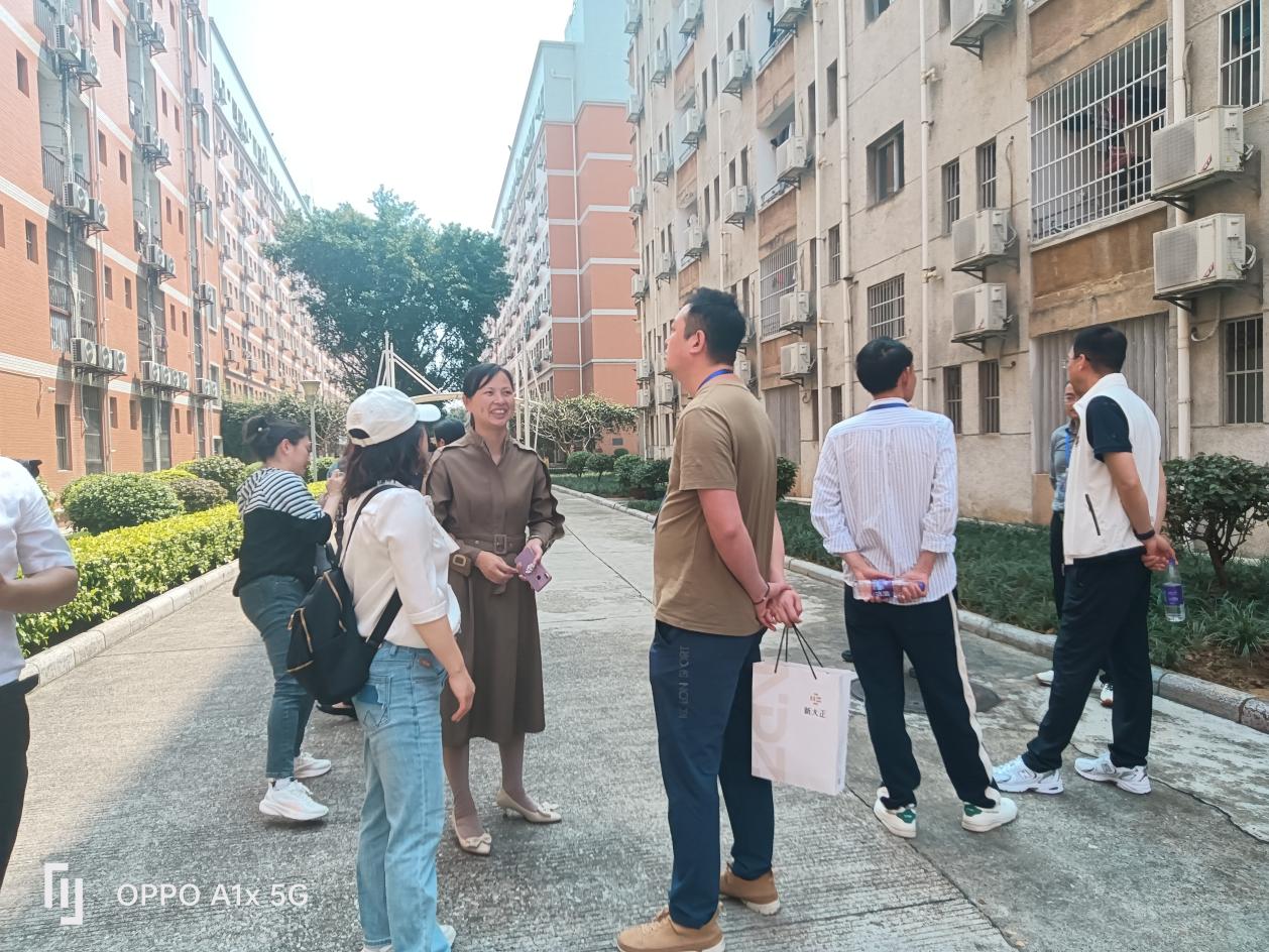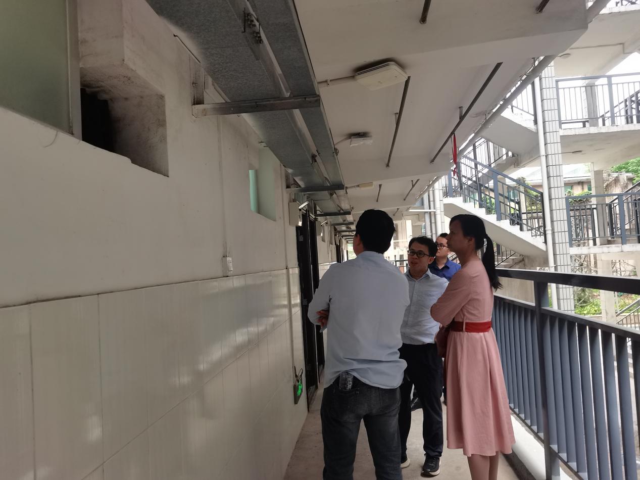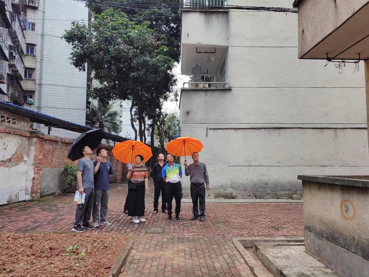 工作人员和设计公司现场勘查西28栋项目施工内容