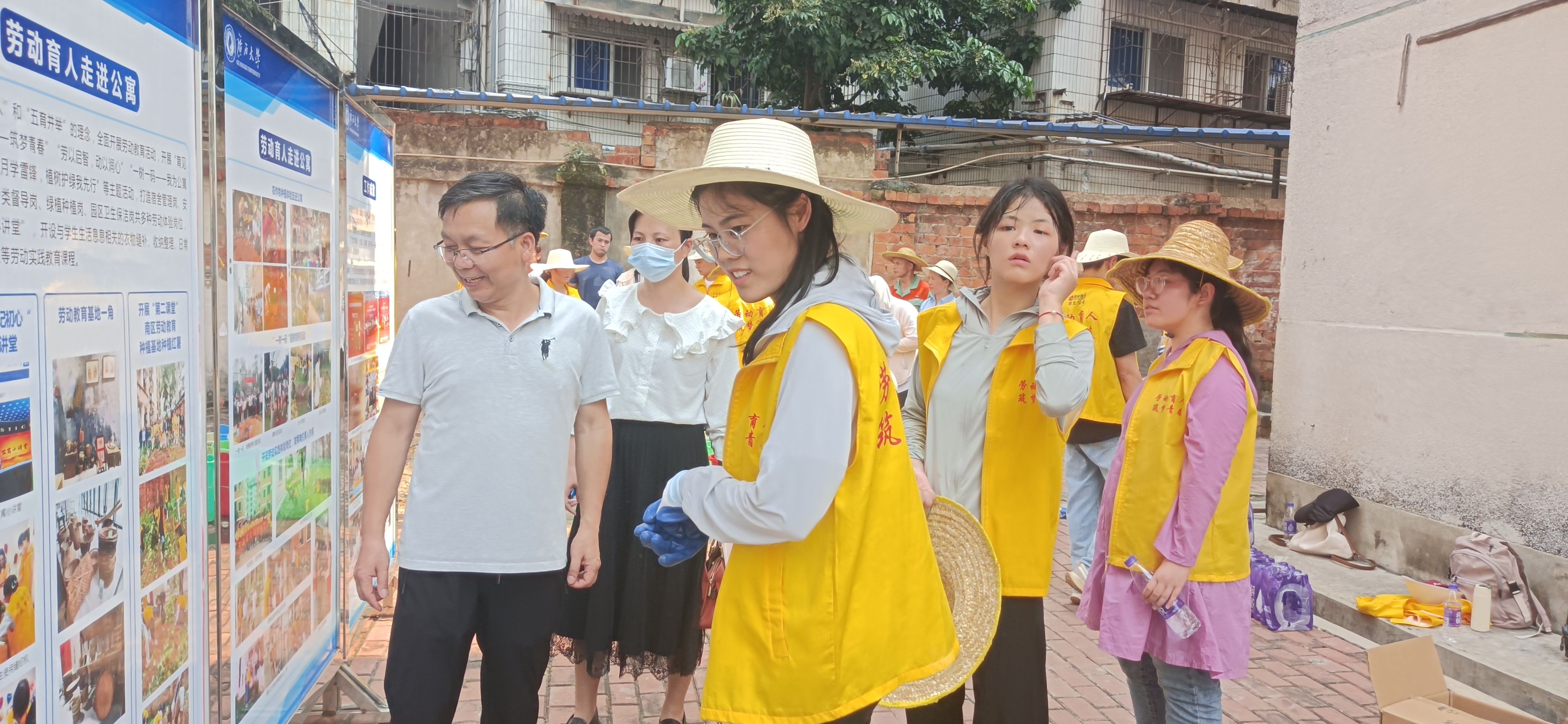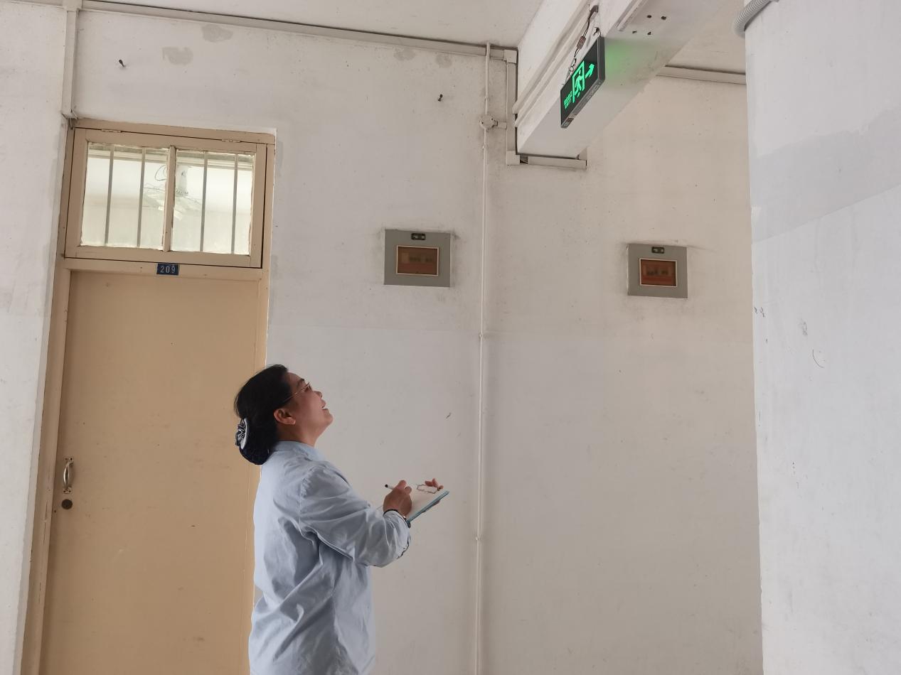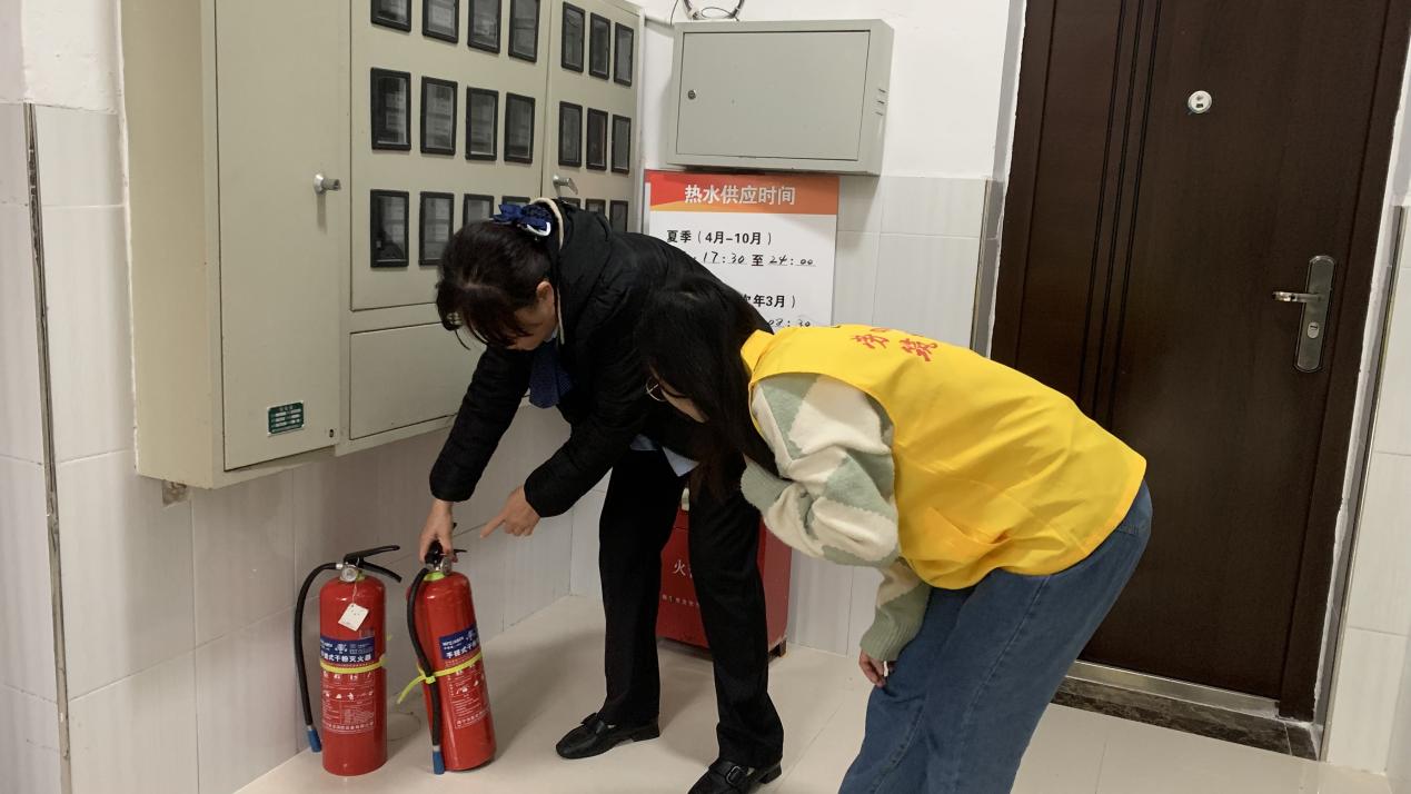 劳动教育老师指导宿舍巡查体验岗同学检查消防器材