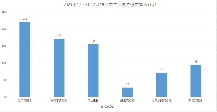 2024年4月13日-4月19日后勤服务24小时报修中心接电话报修、网上报修、现场报修1174单,其中学生公寓报修733单(已完工716单,完工率97.6%,余17单在维修中),其中电气类219单,给排水类170单,木工类154单,基建类27单,冷热水阀类70单,其他类93单,余下441单由其他岗位负责完成维修;在做好每天日常维修的同时,坚持对学生公寓183间电表房, 2个水泵房每天巡检。