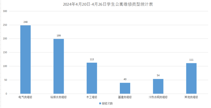 2024年4月20日-26日后勤服务24小时报修中心接电话报修、网上报修、现场报修1250单,其中学生公寓报修765单(已完工743单,完工率97.1%,余22单在维修中),其中电气类248单,给排水类199单,木工类113单,基建类40单,冷热水阀类54单,其他类111单,余下485单由其他岗位负责完成维修;在做好每天日常维修的同时,坚持对学生公寓183间电表房, 2个水泵房每天巡检。