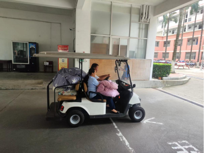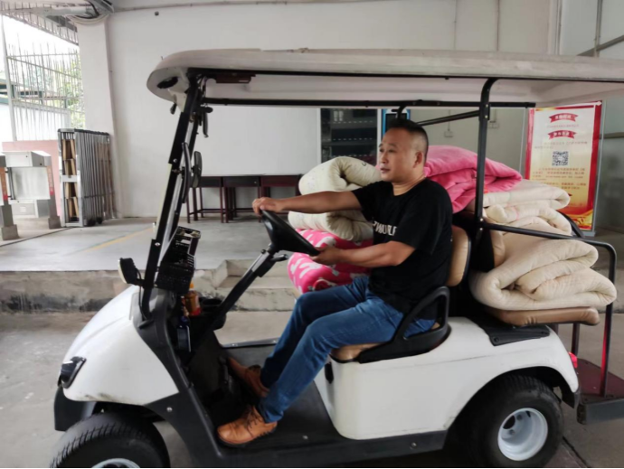 宿管阿叔将晾晒好的被子送回各楼栋