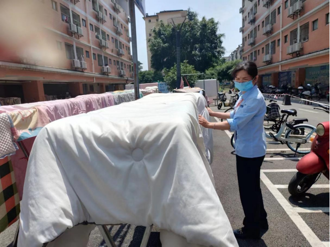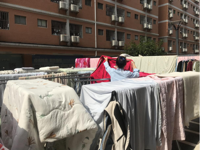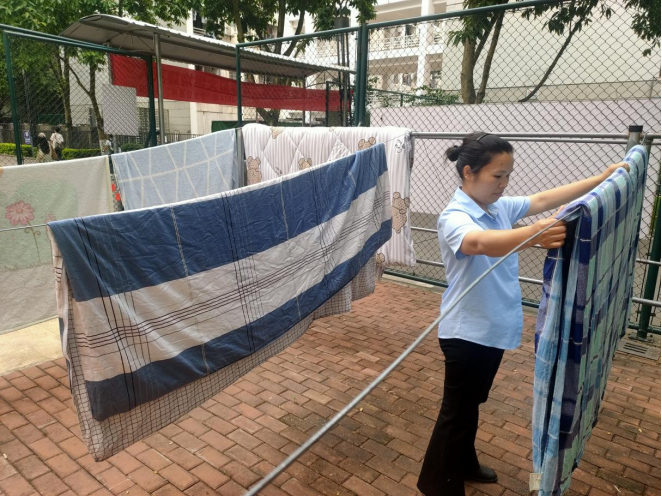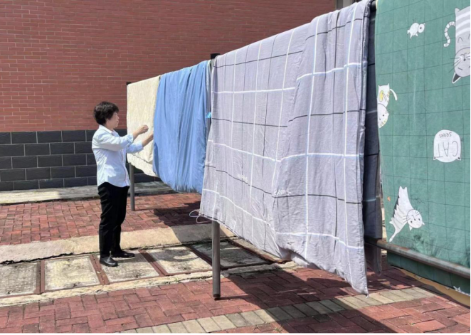 宿管阿姨晾晒同学们的被子