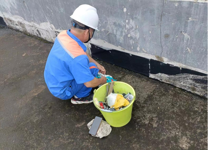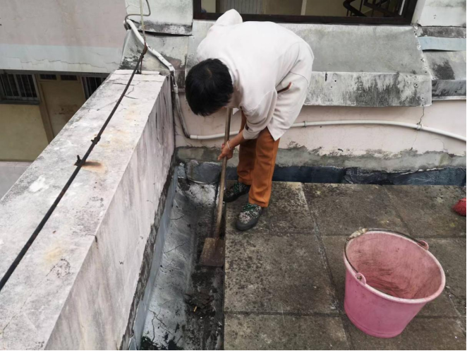 师傅修补东21栋楼顶渗水裂缝