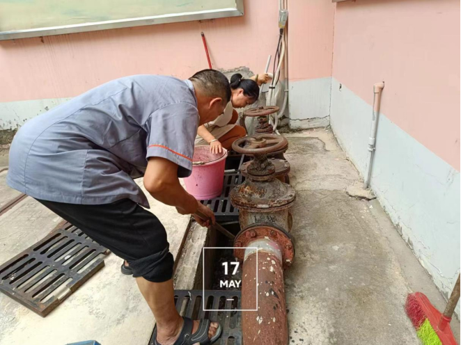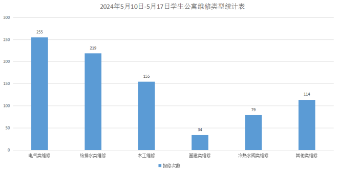 2024年5月10日-17日后勤服务24小时报修中心接电话报修、网上报修、现场报修1355单,其中学生公寓报修856单(已完工829单,完工率96.8%,余27单在维修中),其中电气类255单,给排水类219单,木工类155单,基建类34单,冷热水阀类79单,其他类114单,余下499单由其他岗位负责完成维修;在做好每天日常维修的同时,坚持对学生公寓183间电表房, 2个水泵房每天巡检。