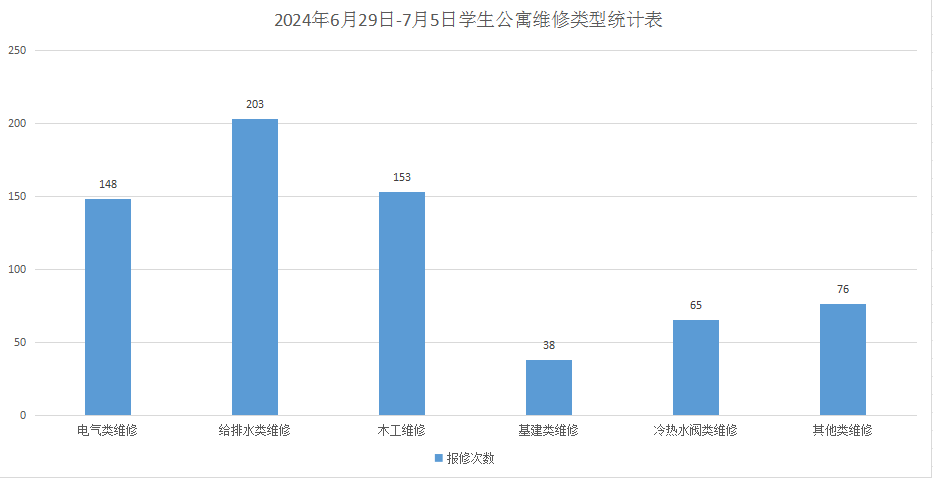 2024年6月29日-7月5日后勤服务24小时报修中心接电话报修、网上报修、现场报修1187单,其中学生公寓报修683单(已完工677单,完工率99%,余6单在维修中),其中电气类148单、给排水类203单、木工类153单、基建类38单、冷热水阀65单、其他类76单,余下504单由其他岗位负责完成维修。坚持对学生公寓183间电表房, 2个水泵房每天巡检。