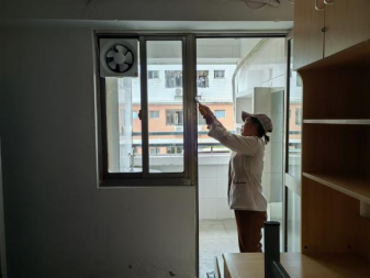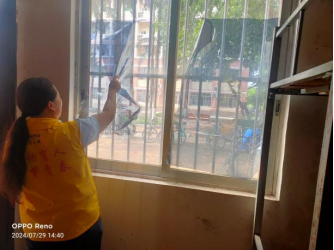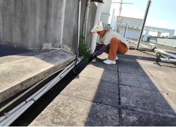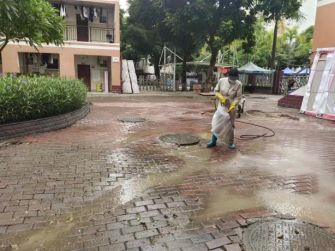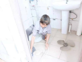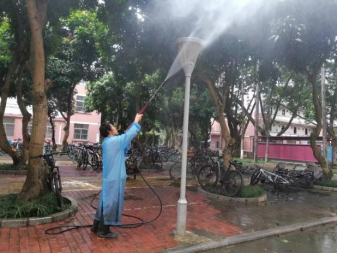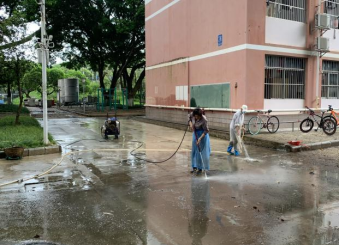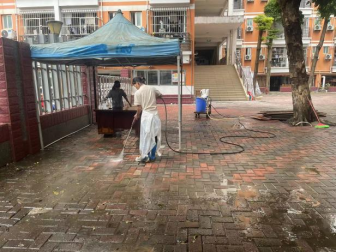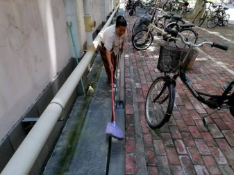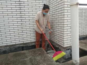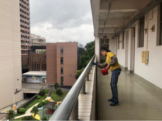 三、为了给学生提供一个干净、舒适、整洁的环境,工作人员对学生公寓门厅、走廊、楼道、栏杆扶手、玻璃门等公共设施进行全面的清洁打扫。暑假期间,完成学生公寓迎新房6030个风扇以及720台排风扇的清洗保洁工作;学生公寓园区假期排水沟清淤保洁水沟46条,长度约2200米,清理6个楼栋学生公寓天台的排水设施内淤泥共3次;完成西5园区,东19栋的路面清洗工作,留学生大楼正在清洗中,共计清洗路面及三米以下墙面约10725平方米。