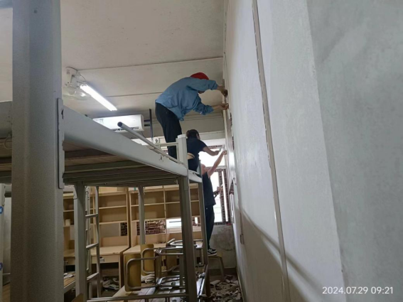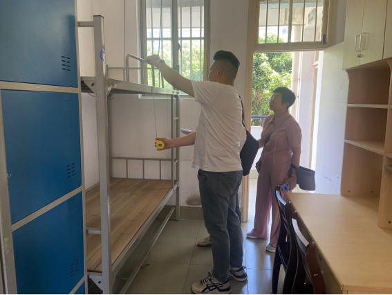 1.为2024级新生提供舒适居住条件,太阳集团tyc138利用暑期完成了学生公寓西28AB栋、东31-35栋共8栋学生宿舍楼的维修改造(6900多个床位),修缮西1-15栋、东10栋、东11栋、东1A、1B、2A、2B栋等20栋学生公寓毕业生腾空宿舍770多间(5600多个床位),对毕业生521间房间进行粉刷,更换了349个入户大门、94个阳台门、7个洗漱间门、73个卫生间门,处理了15间非顶层房间的宿舍漏水情况,拆除了190间房的壁柜,对207个铁床生锈进行除锈补漆,完成了西16-27栋、专AB栋、东8-11栋等34栋学生公寓“拆窗破网”1521间宿舍的逃生窗安装工作,完成37楼栋公共区域护栏除锈刷漆工作,调整搬迁898套铁架床,170套蓝色铁皮组合床、649套组合书桌、1015张凳子等,显著改善学生的住宿条件,并对所有新生房间进行了线路检修、安全巡查、卫生保洁等,有效预防安全隐患,营造干净、整洁、优美的公寓环境。