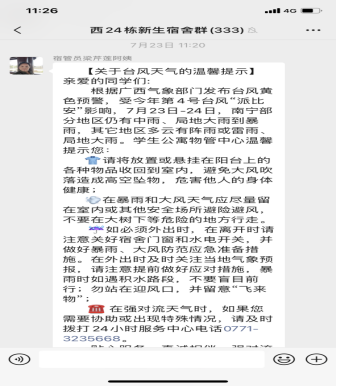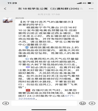 学生公寓宿管员坚守服务一线,用心做好留校学生住宿安全保障工作;每日核查统计留校学生人数,时刻掌握留校学生动态;及时在楼栋QQ群推送关于安全管理、突发天气等温馨提示,让留校学生假期生活舒心又温暖。