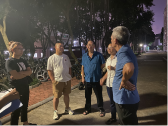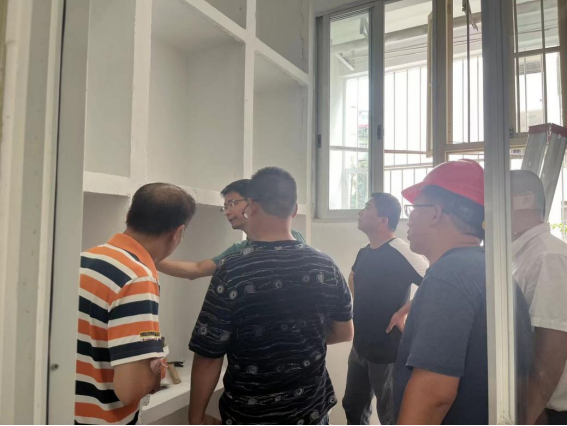 工作人员与施工队到东31-35栋现场对接施工改造项目
