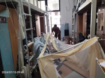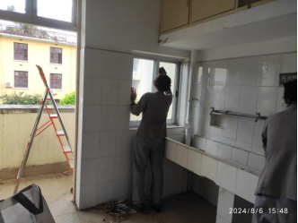 二、维修在暑假期间,学生公寓毕业生维修房间共计2576间,其中西校园864间,东校园1712间,以及包括换门、房间门锁、修复门面、合页、玻璃等5908单的木工类维修;包括宿舍瓷砖、墙面、便盆、洗手台加固等4860单土建类维修。
