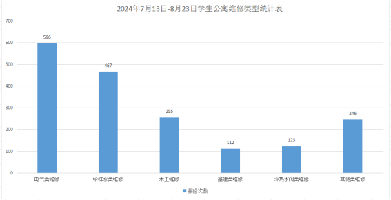 2024年7月13日-2024年8月23日后勤服务24小时联络中心接电话报修、网上报修、现场报3578单,其中学生公寓报修1799单(已完工1796单,完工率99.8%,余3单在维修中)。学生公寓报修单按类别分类:其中电气类596单、给排水类467单、木工类255单、基建类112单、冷热水阀123单、其他类246单,余下1799单由其他岗位负责完成维修。