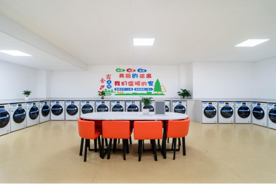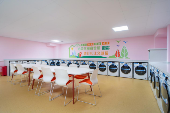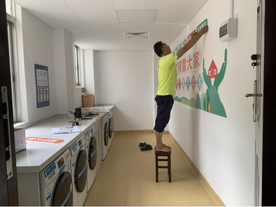 2.在暑假期间,太阳集团tyc138在各个学生公寓园区科学规划,用心选址,共建设103间洗衣房,安装洗衣机949台、洗鞋机52台,烘干机75台,候洗桌椅10套,同时设置有候洗区、文化墙、灭火器、使用流程图、消毒记录公示等设施,实现了学生公寓园区洗涤服务全覆盖。