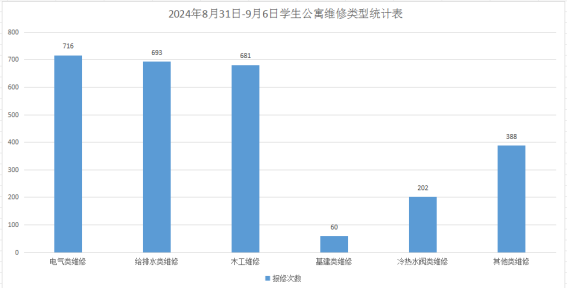 2024年8月31日-9月6日后勤服务24小时报修中心接电话报修、网上报修、现场报修4417单,其中学生公寓报修2740单(已完工2554单,完工率93.2%,余186单在维修中),其中电气类716单、给排水类693单、木工类681单、基建类60单、冷热水阀202单、其他类388单,余下1677单由其他岗位负责完成维修。坚持对学生公寓183间配电房, 72个电表箱,2个水泵房每天巡检。