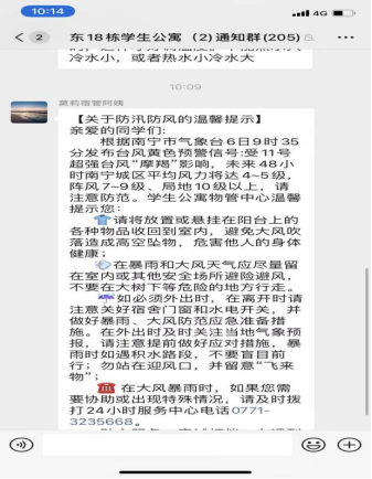 积极应对即将到来的台风大雨等强对流天气,工作人员对学生公寓各楼栋、围墙、电气设备、排水设施、枯树枝、学生公寓周边自然环境等进行全面排查,对发现的隐患和问题及时处理及汇报。