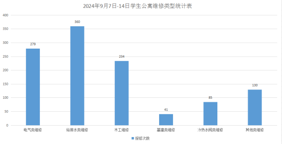 2024年9月7日-9月14日后勤服务24小时报修中心接电话报修、网上报修、现场报修2516单,其中学生公寓报修1129单(已完工1091单,完工率96.6%,余38单在维修中),其中电气类279单、给排水类360单、木工类234单、基建类41单、冷热水阀85单、其他类130单,余下1387单由其他岗位负责完成维修。坚持对学生公寓183间配电房, 72个电表箱,2个水泵房每天巡检。