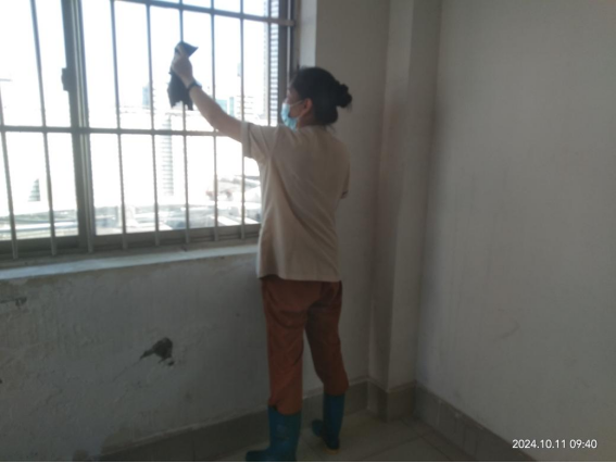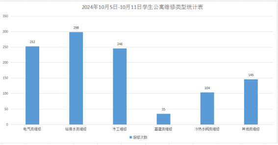 2024年10月5日-10月11日后勤服务24小时报修中心接电话报修、网上报修、现场报修1611单,其中学生公寓报修1081单(已完工1045单,完工率96.6%,余36单在维修中),其中电气类252单、给排水类298单、木工类246单、基建类35单、冷热水阀104单、其他类146单,余下530单由其他岗位负责完成维修。坚持对学生公寓183间配电房, 72个电表箱,2个水泵房每天巡检。