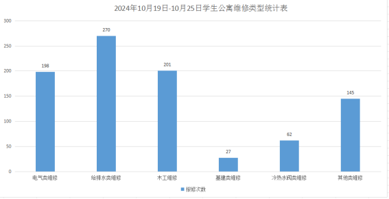2024年10月19日-10月25日后勤服务24小时报修中心接电话报修、网上报修、现场报修1387单,其中学生公寓报修903单(已完工880单,完工率97.4%,余23单在维修中),其中电气类198单、给排水类270单、木工类201单、基建类27单、冷热水阀62单、其他类145单,余下484单由其他岗位负责完成维修。坚持对学生公寓183间配电房, 72个电表箱,2个水泵房每天巡检。