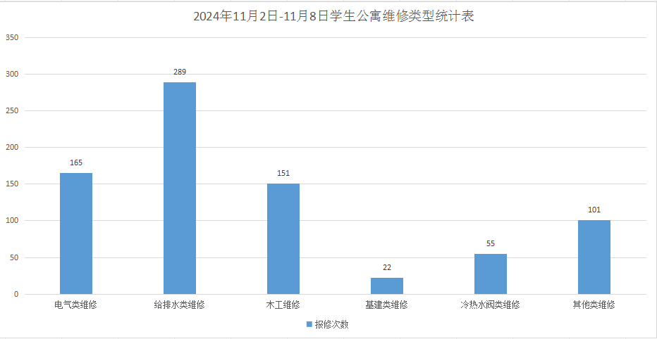 2024年11月2日-11月8日后勤服务24小时报修中心接电话报修、网上报修、现场报修1115单,其中学生公寓报修783单(已完工776单,完工率99.1%,余7单在维修中),其中电气类165单、给排水类289单、木工类151单、基建类22单、冷热水阀55单、其他类101单,余下332单由其他岗位负责完成维修。坚持对学生公寓183间配电房, 72个电表箱,2个水泵房每天巡检。