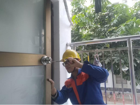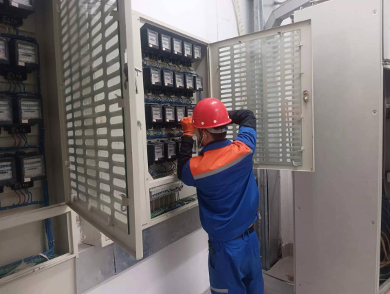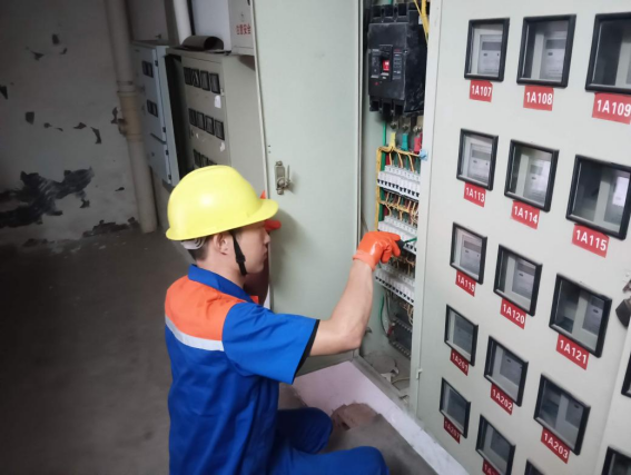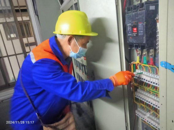 工作人员逐间对配电房进行线路排查,拧紧螺丝工作
