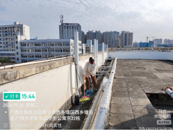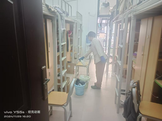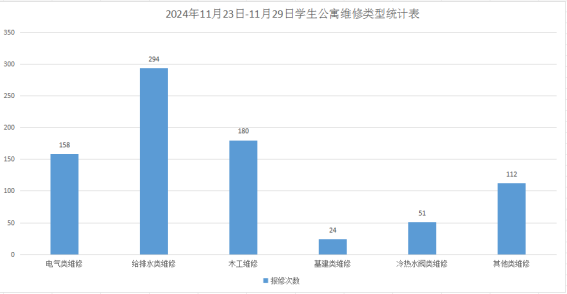 2024年11月23日-11月29日后勤服务24小时报修中心接电话报修、网上报修、现场报修1161单,其中学生公寓报修819单(已完工810单,完工率98.9%,余9单在维修中),其中电气类158单、给排水类294单、木工类180单、基建类24单、冷热水阀51单、其他类112单,余下342单由其他岗位负责完成维修。坚持对学生公寓84间配电房, 178个电表箱,2个水泵房每天巡检。