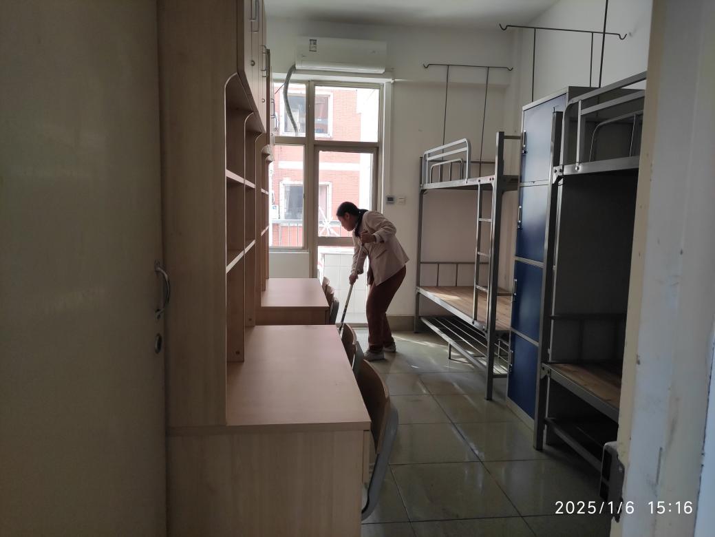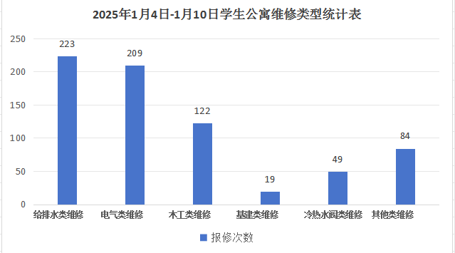 2025年1月4日-1月10日后勤服务24小时报修中心接电话报修、网上报修、现场报修954单,其中学生公寓报修706单(已完工667单,完工率94.5%,余39单在维修中),其中给排水类223单、电气类209单、木工类122单、基建类19单、冷热水阀49单、其他类84单,余下248单由其他岗位负责完成维修。坚持对学生公寓84间配电房, 178个电表箱,2个水泵房每天巡检。