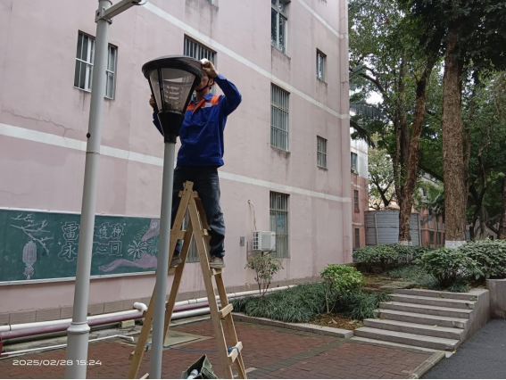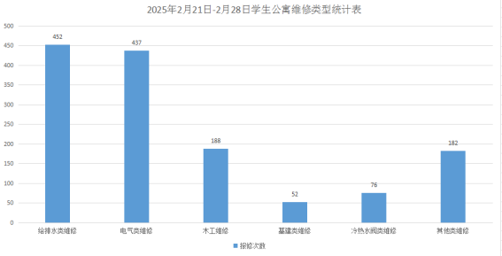 2025年2月21日-28日学生公寓共接单1387单,其中给排水类452单、电气类437单、木工类188单、基建类52单、冷热水阀76单、其他类182单,已完工1376单,完工率99.2%,余11单在维修中。坚持对学生公寓84间配电房, 178个电表箱,2个水泵房坚持日常巡检。