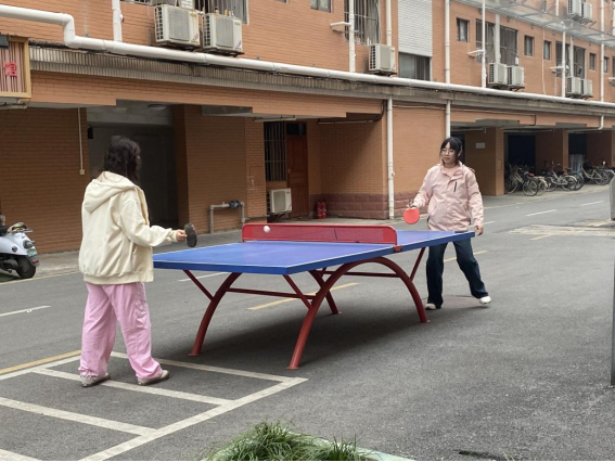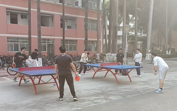 同学们在园区打乒乓球