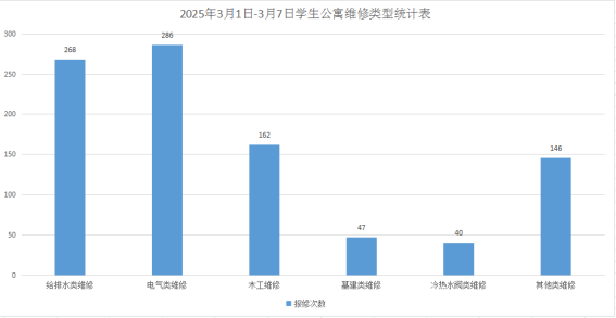 2025年3月1日-7日学生公寓共接维修949单,其中给排水类268单、电气类286单、木工类162单、基建类47单、冷热水阀40单、其他类146单,已完工937单,完工率98.7%,余12单在维修中。对学生公寓84间配电房, 178个电表箱,2个水泵房坚持日常巡检。