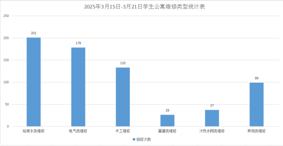 2025年3月15日-21日学生公寓共接单674单,其中给排水类201单、电气类178单、木工类133单、基建类26单、冷热水阀37单、其他类99单,已完工661单,完工率98.07%,余13单在维修中。坚持对学生公寓84间配电房, 178个电表箱,2个水泵房日常巡检。