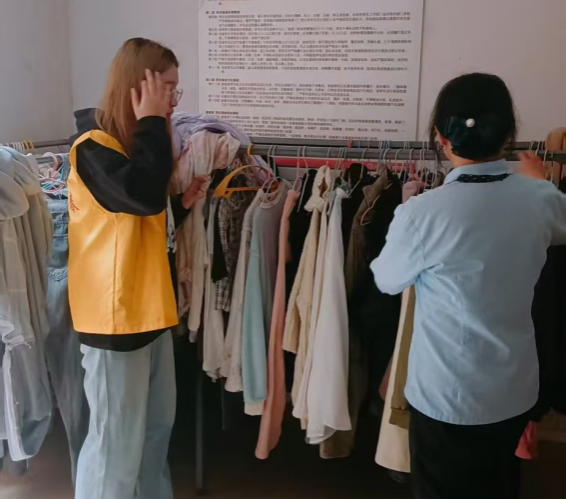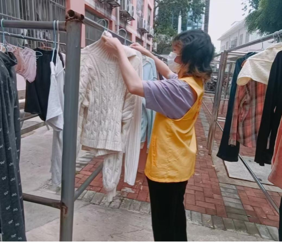 劳动教育岗同学协助阿姨整理掉落的衣物