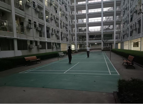 同学们在园区羽毛球场打羽毛球