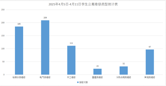 2025年4月5日-4月11日学生公寓共接单657单,其中给排水类185单、电气类209单、木工类111单、基建类23单、冷热水阀32单、其他类97单,已完工635单,完工率96.65%,余22单在维修中。坚持对学生公寓84间配电房, 178个电表箱,2个水泵房日常巡检。