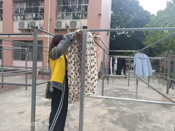 劳动教育岗同学协助阿姨整理掉落的衣物