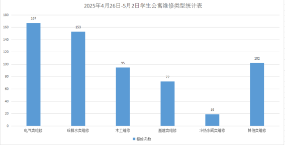 2025年4月26日-5月2日学生公寓共接单608单,其中电气类167单、给排水类153单、木工类95单、基建类72单、冷热水阀19单、其他类102单,已完工585单,完工率96.2%,余23单在维修中。坚持对学生公寓84间配电房, 178个电表箱,2个水泵房日常巡检。