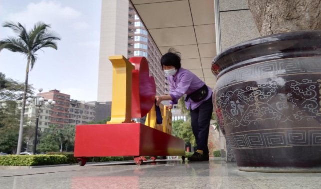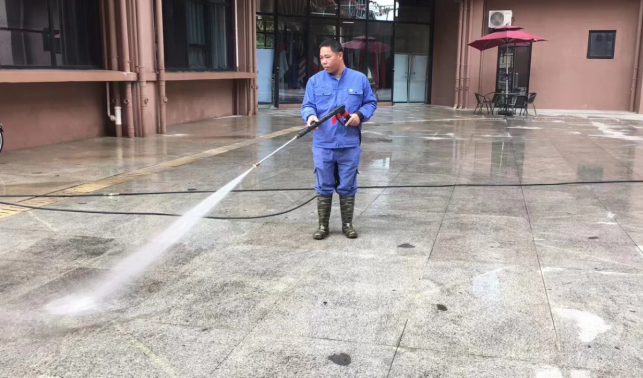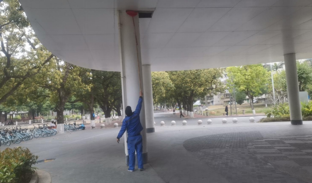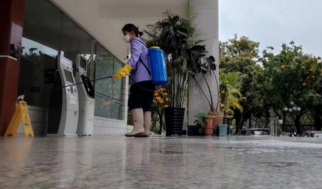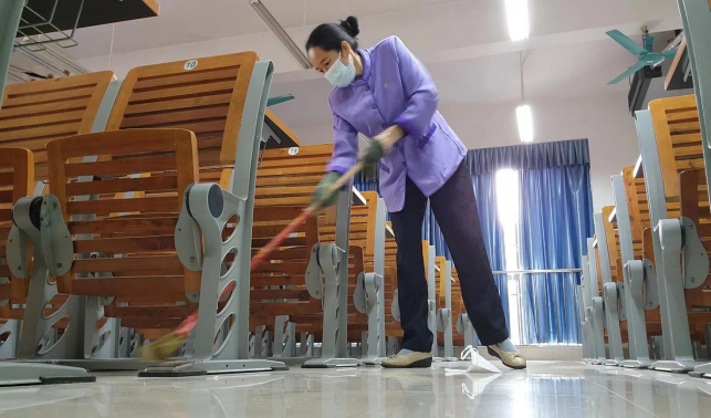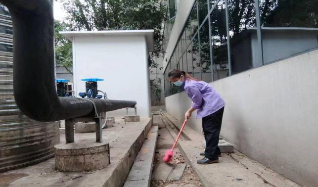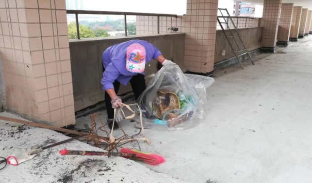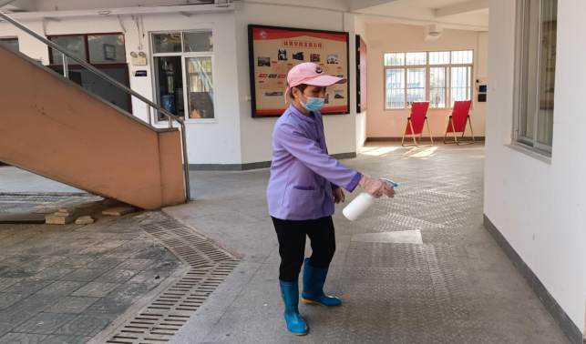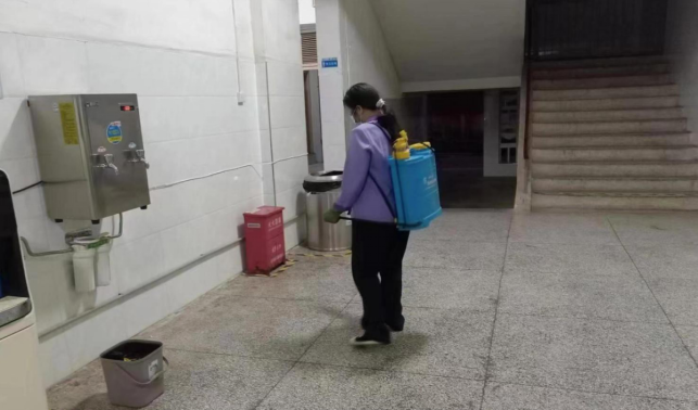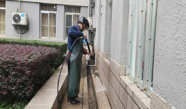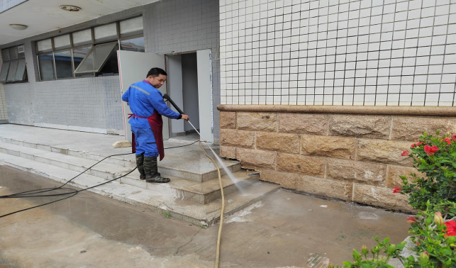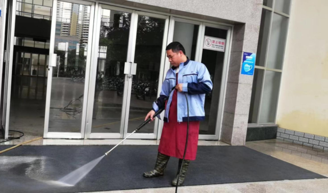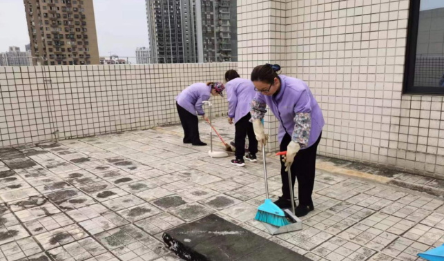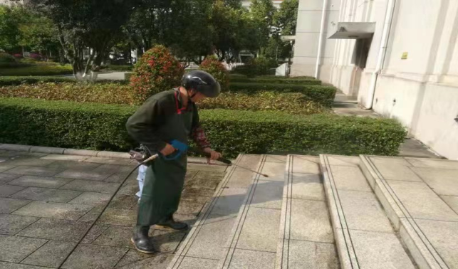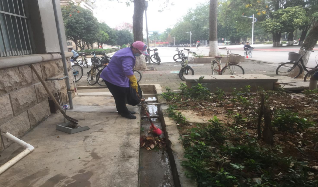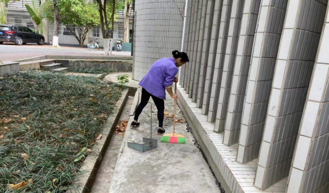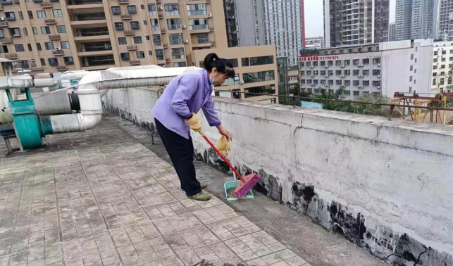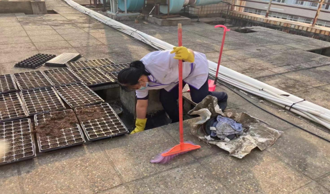 本周对语言中心、二教、三教、六教、十教、十一教、研究生院和行健学院一教、二教、三教、四教共11栋教学楼宇进行日常卫生保洁服务工作,清除公共楼宇外围寄生绿植4次,清理公共楼宇排水设施48次,冲洗公共楼宇露天区域7栋;清理公共楼宇天台32栋。对公共教学楼宇的楼梯、走廊、门把手、课桌椅、电脑键盘、鼠标、水龙头、楼梯扶手、电梯间及按钮等高频接触表面进行重点杀菌消毒1332次。