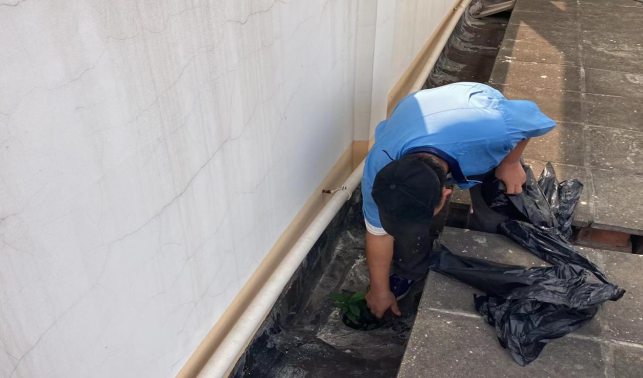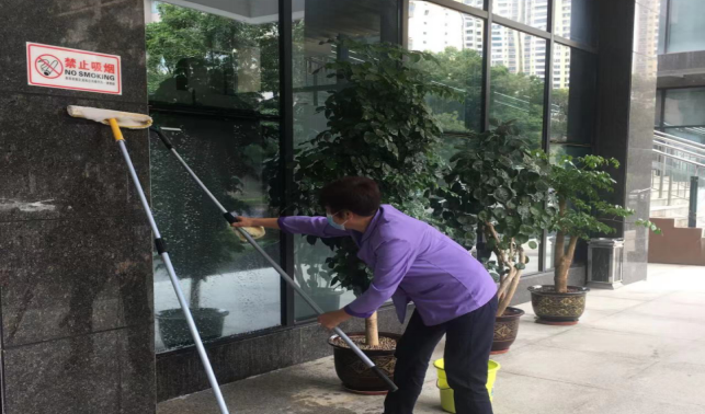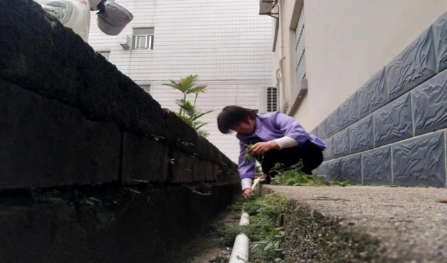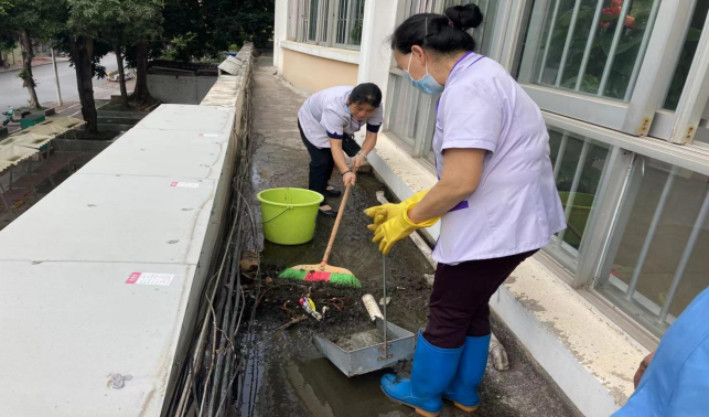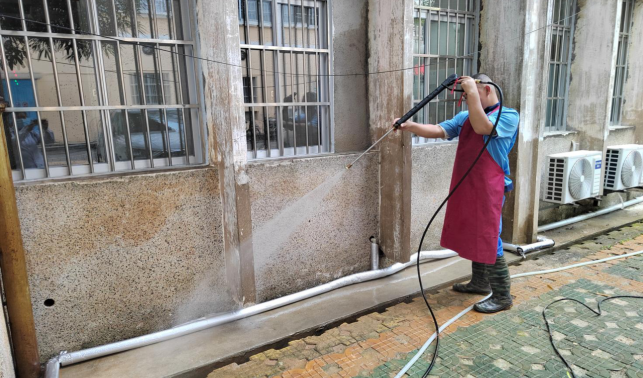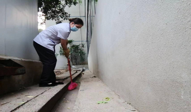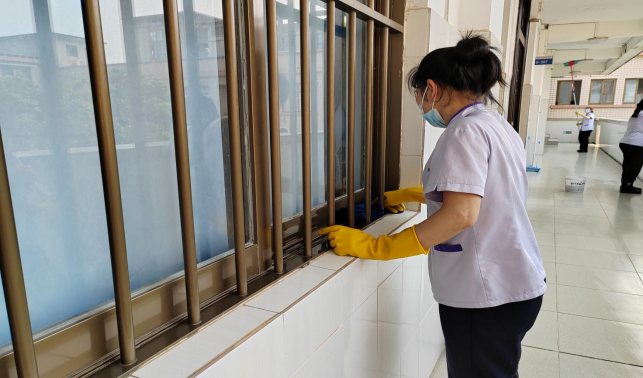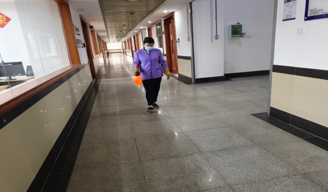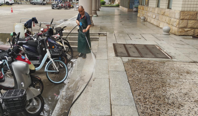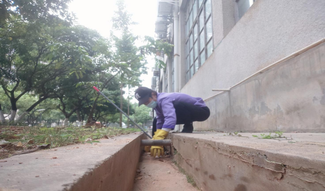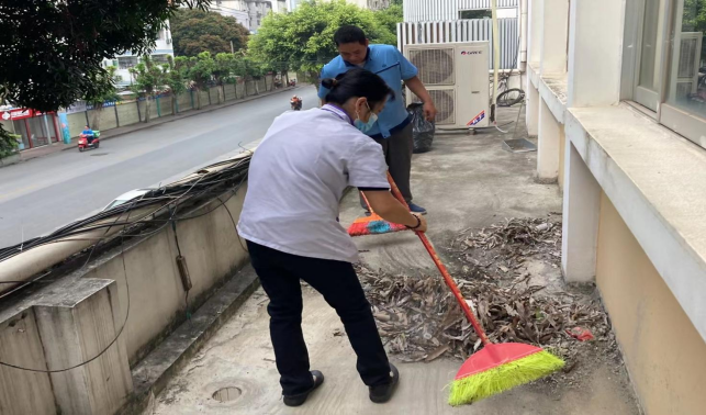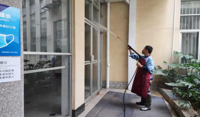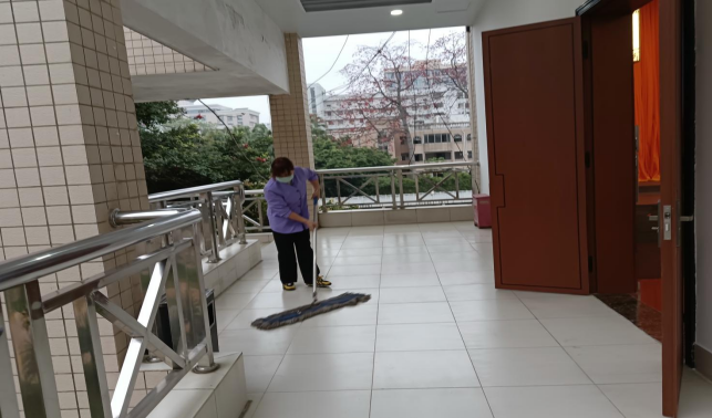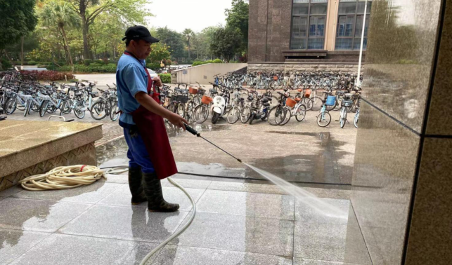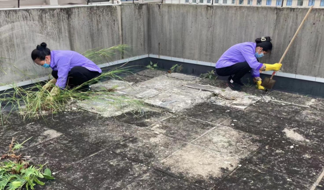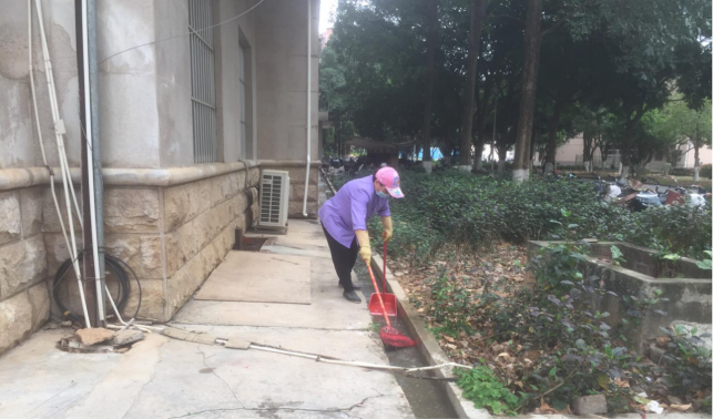 本周对语言中心、二教、三教、六教、十教、十一教、研究生院和行健学院一教、二教、三教、四教共11栋教学楼宇进行日常卫生保洁服务工作,清除公共楼宇外围寄生绿植2次,清理公共楼宇排水设施47次,冲洗公共楼宇露天区域5栋;清理公共楼宇天台33栋。对公共教学楼宇的楼梯、走廊、门把手、课桌椅、电脑键盘、鼠标、水龙头、楼梯扶手、电梯间及按钮等高频接触表面进行重点杀菌消毒972次。