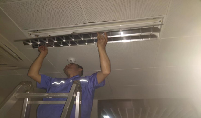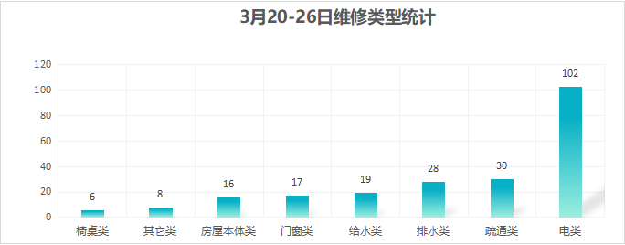 对学校公共设施进行日常巡查、维护,发现问题及时维修、抢修。师生报修问题随报随修,确保公共设施正常运行。本周共接单226单,其中电类102单,给水类19单,门窗类17单,排水类28单,疏通类30单,房屋本体类16单,桌椅类6单,其他类8单,完成212单。