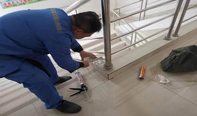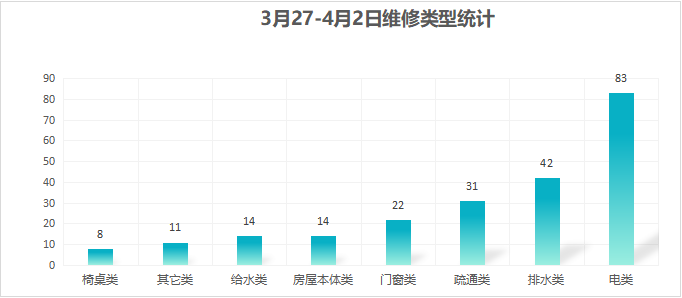 对学校公共设施进行日常巡查、维护,发现问题及时维修、抢修。师生报修问题随报随修,确保公共设施正常运行。本周共接单225单,其中电类83单,给水类14单,门窗类22单,排水类42单,疏通类31单,房屋本体类14单,桌椅类8单,其他类11单,完成204单。